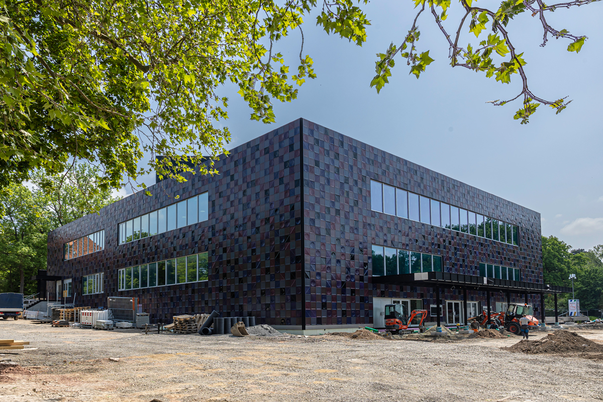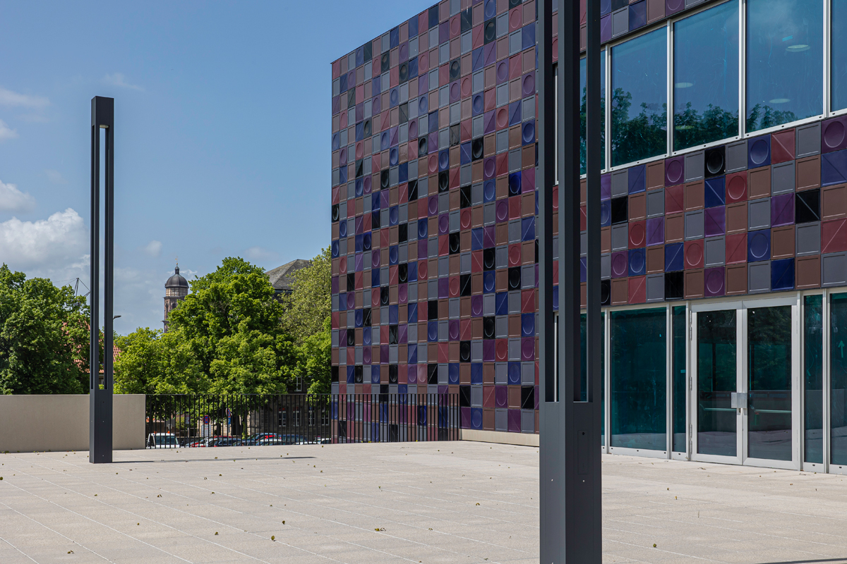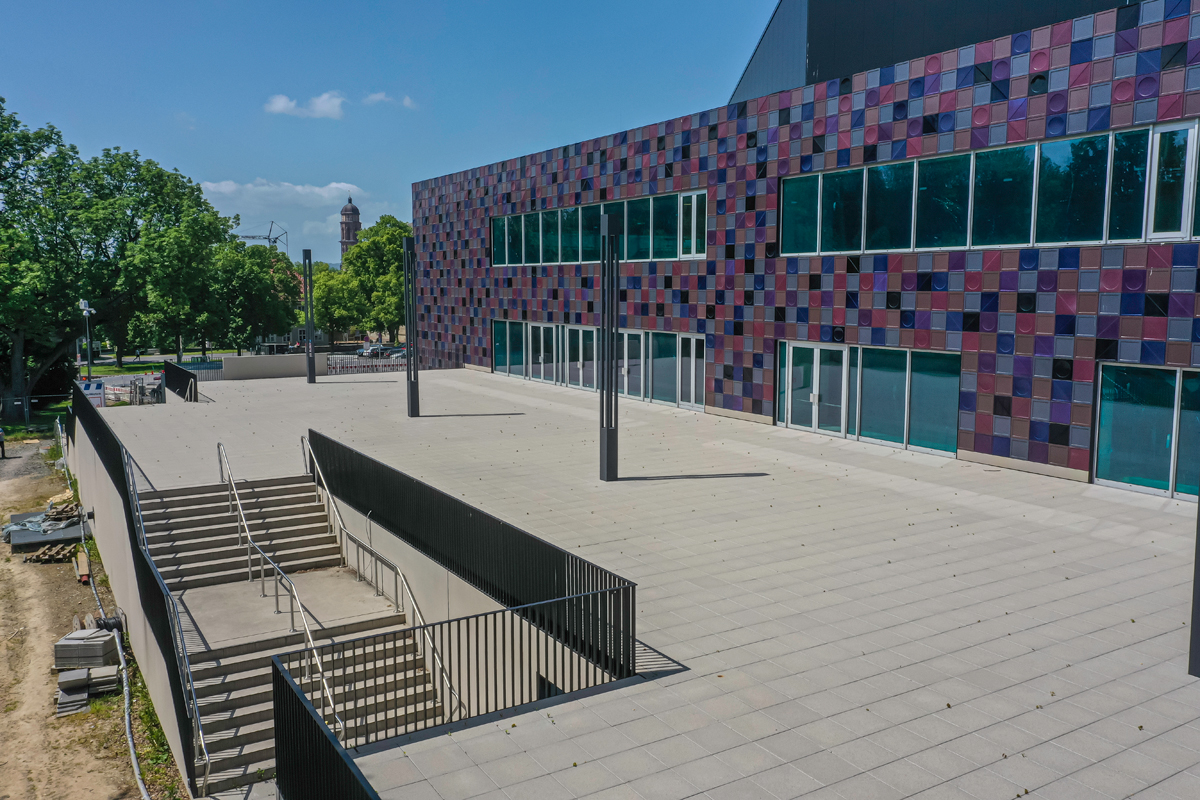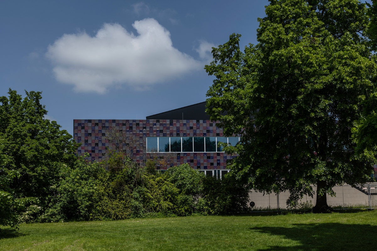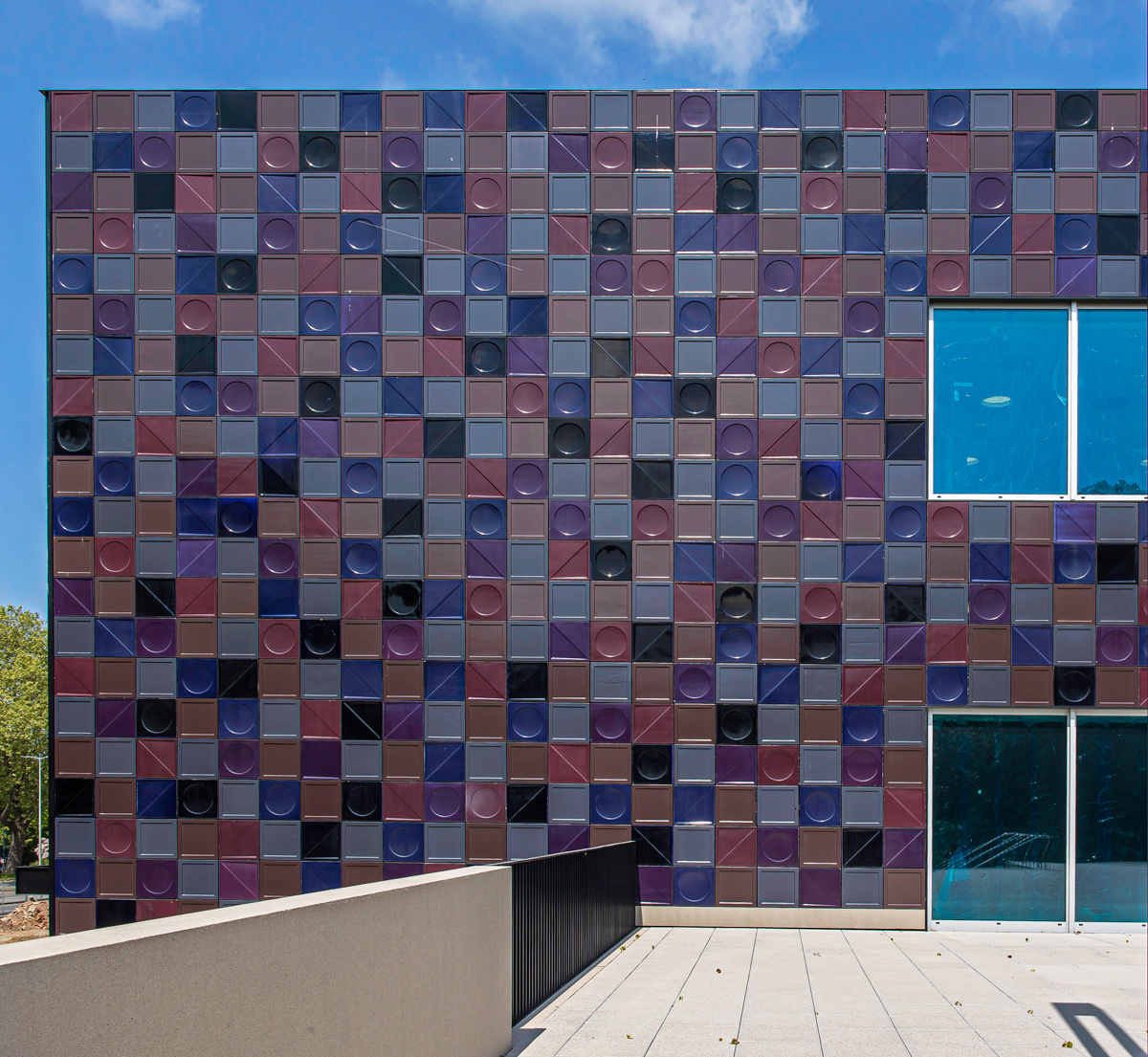 Die 50 x 50 x 3 cm großen Keramikplatten verfügen über zwei verschiedene geometrische Reliefs mit Kreis und Dreieck so- wie fünf Farbglasuren in Dunkelblau, Blau, Rot, Violett und Weiß. Neue Kacheln in Altrosa und Taubenblau bleiben im Farb-Duktus der Bestandskacheln. Das quadratische Relief der neuen Kacheln ergänzt die geometrischen Grundformen des Bestands. Die Anbauten (Logistik und Vordächer) sind mit den weißen Kacheln bekleidet worden, der Hallenkörper ist ausschließlich bunt gestaltet. „Die neue Fassade verbindet Vergangenheit und Zukunft des Gebäudes auf nachhaltige Art und Weise“, betont Heiko Sasse, Gesellschafter des Architek- turbüros soll sasse architekten BDA. „Die von Weitem farblich flächig wirkende Fassade zeigt während der Annäherung zu- dem ein differenziertes und heterogenes Farbspiel, was durch die geometrischen Reliefs noch verstärkt und erweitert wird – ähnlich der Stadt als einheitlichem Gefüge, das aber aus un- terschiedlichen Individuen besteht.“