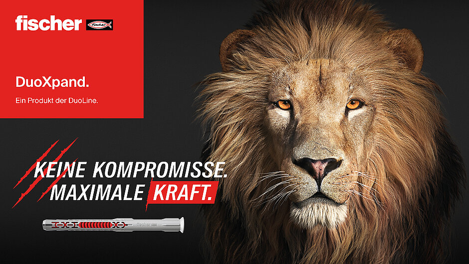 „Keine Kompromisse. Maximale Performance.“ – darauf ist bei den Kunststoffdübeln der Unternehmensgruppe fischer Ver- lass. Neben dem bestens bekannten DuoPower gehören auch der DuoSeal, der in einem Arbeitsschritt befestigt und abdich- tet, der Kippdübel DuoTec, der Plattendübel DuoBlade sowie der neu eingeführte Langschaftdübel DuoXpand zur Produkt- familie. Um die Bekanntheit des Sortiments weiter zu steigern, startet fischer eine umfassende Marketingkampagne. Sinnbild- lich für die starken Befestigungslösungen steht der in den Wer- bemitteln vorkommende Löwe, der verschiedene Produktei- genschaften des DuoXpand verkörpert – vom festen Biss (ma- ximale Haltewerte) über sanfte Pfoten (materialschonendes Verspreizen) bis hin zur hohen Sprungkraft (für verschiedene Verankerungstiefen geeignet).