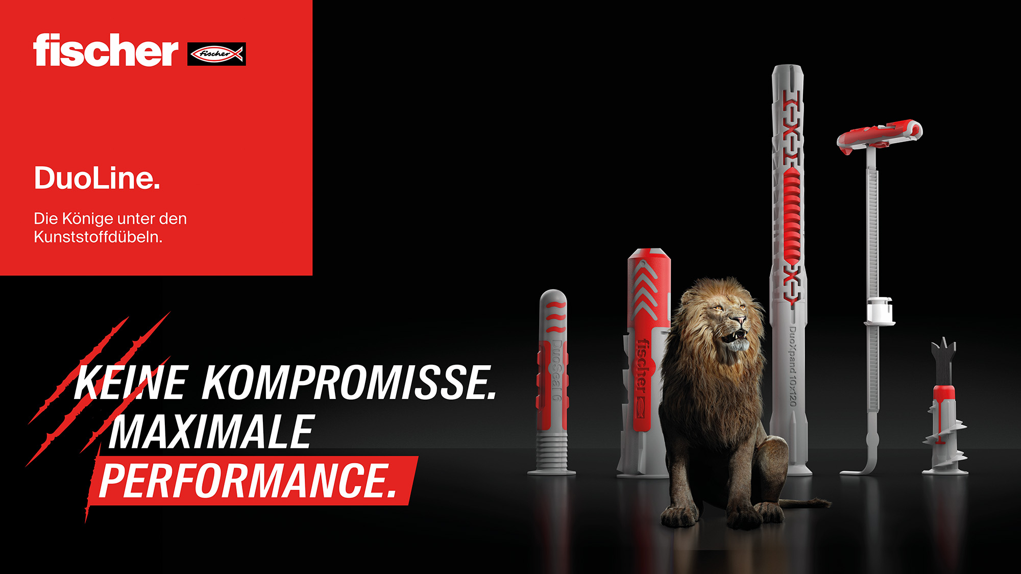 Die Stärke, den festen Biss und die hohe Sprungkraft – das haben der majestätische Löwe und die fischer DuoLine Produktfamilie gemeinsam. Deutlich wird dies in der aktu- ellen Werbekampagne des Befestigungsexperten, bei der die Kunststoffdübel für verschiedene Anwendungen im Mittelpunkt stehen.