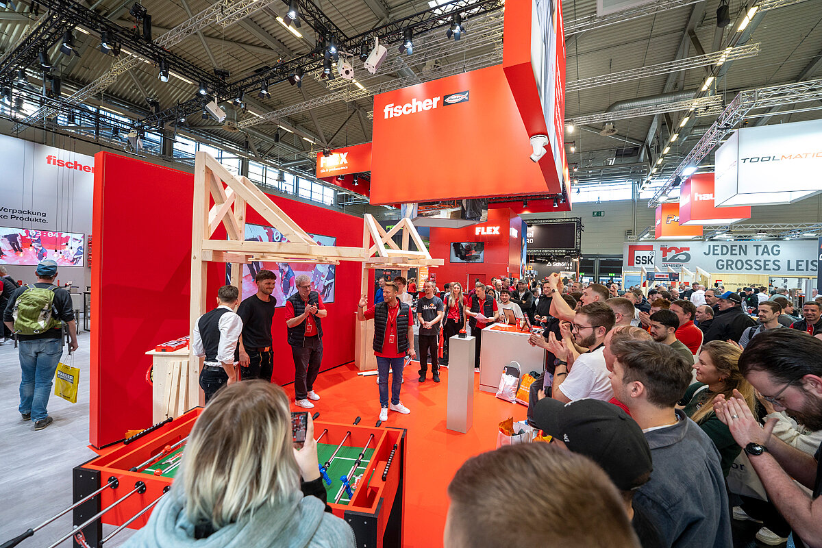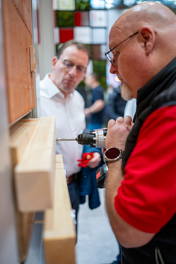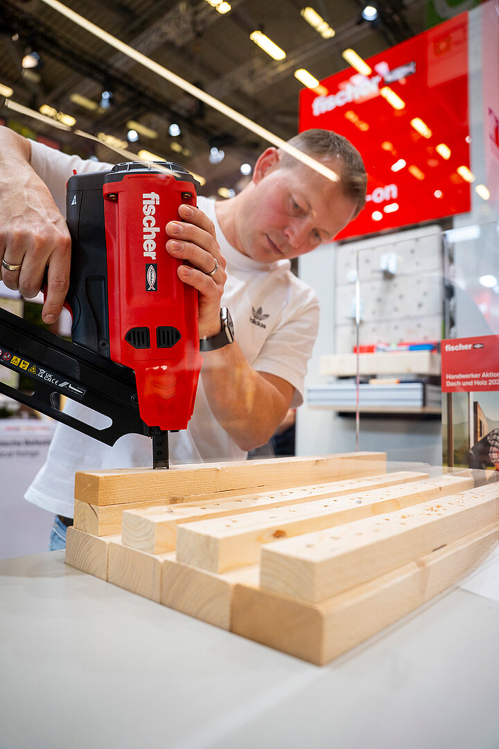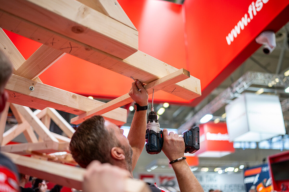 Interaktive Handwerker- und Profi-Challenges, Aktionen und Live-Demonstrationen machten den Stand zum Publikumsmagneten. Für besondere Dynamik sorgten die stündlichen Handwerker-Challenges: Zwei Zweier-Teams traten gegeneinander an und realisierten eine typische Holzbauanwendung auf Zeit. Aufgabe war, eine Deckenunterkonstruktion aus Holzlatten an einer Holzkonstruktion anzubringen – inklusive Überkopfmontage. Mit der Justierschraube »FAFS« gelang die Ausrichtung stufenlos und präzise, das Einschrauben schnell und komfortabel. Großen Zuspruch erhielt auch der Hands-on-Bereich, in dem Produkte in Holz, Beton und Hochlochziegeln ausgiebig getestet wurden. Mit dabei: das Setzgerät »FGW 90F«, mit dem zahlreiche Besucher Nägel effizient und sicher in Holz eintrieben.