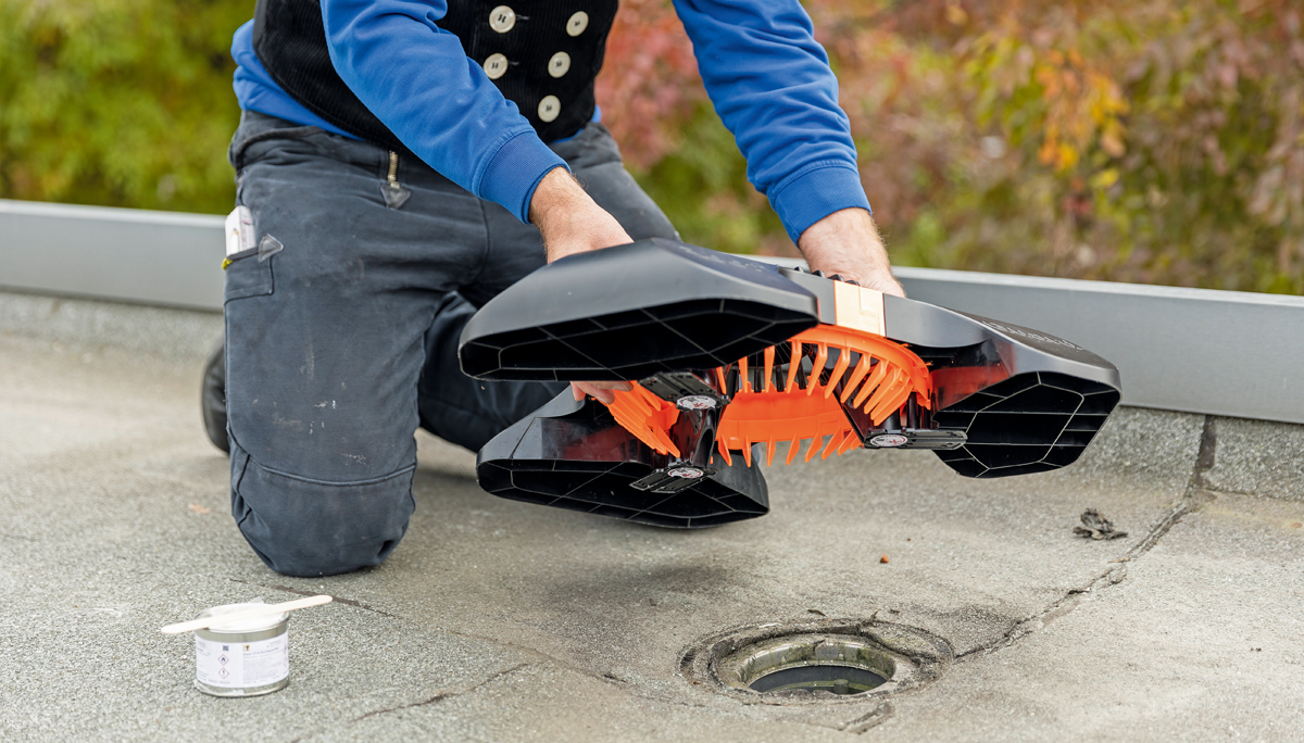 Am Flachdach-Exponat werden diverse Zubehörprodukte beispielhaft realen Einbausituationen nachempfunden, wie z. B. der neuartige Rechtecknotüberlauf aus Polypropylen (PP), der verpresste Winkelablauf mit Flanschmanschette aus Bitumen-Schweißbahn sowie der neue 4-in-1 Flachdachlüfter, den es zukünftig auch für Lüftungsleitungen DN 150, DN 200 und DN 250 geben wird. Aber auch Kontrollschächte und Sanierungsgullys werden vorgestellt. Darüber hinaus hat Fleck ein digitales Warnsystem im Gepäck. Mit dabei ist der »Roofguard« – ein Laubsieb, welches sich selbstständig von Laub befreit und mit dem optional erhältlichen Funkmodul »Fleck connect« Statusmeldungen direkt vom Dach sendet.