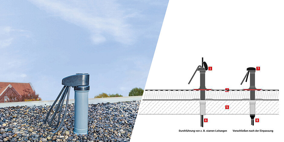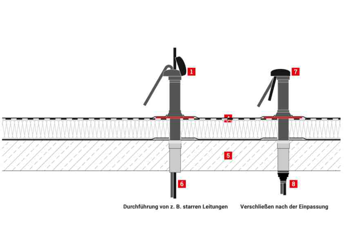 Bei Einzelstrang-Durchführungen für Kabel, Rohre oder Blitzschutzstützen hat Fleck ergänzend zum umfangreichen Schwanenhals-Produktprogramm, welches diverse Flansch-Manschetten zum Anschluss an die jeweilige Dachhaut bietet, auch mehrere Varianten des »Schrumpfi«-Flachdach-Allzweck-Durchgangs im Programm. Dieser ist innen vollflächig mit Schmelzkleber beschichtet. Beim fachgerechten Anschrumpfen mit einem handelsüblichen Heißluftgerät entsteht so ein dauerhafter, wasserdichter Verbund mit dem Flanschkörper und der Durchführung.