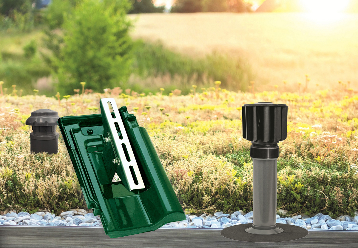 Fleck rückt auf der Messe vor allem seine Gründachlüfter in den Fokus, die Feuchtigkeit unter den Dachschichten vermeiden und eine zuverlässige Belüftung gewährleisten. Die Modelle »Classic« und »Max« eignen sich speziell für hohe Schichtaufbauten ab 50 cm. Dank doppelwandiger Konstruktion mit integrierter Wärmedämmung beugen sie der Kondensatbildung zuverlässig vor und eignen sich so für die Be- und Entlüftung extensiv sowie intensiv begrünter Flach- und Umkehrdächer. Höhe und Zubehör für die Lüfter lassen sich individuell an die jeweilige Dachkonstruktion anpassen. Darüber hinaus präsentiert Fleck einen Flachdach-Zwangslüfter mit Rotor für die Anwendung gegen anfallende Feuchtigkeit. Er arbeitet rein windgetrieben und leitet feuchte Luft bereits bei geringer Windgeschwindigkeit aktiv ab – für eine effektive Rücktrocknung und dauerhaften Feuchteschutz. Das robuste Gehäuse aus Polypropylen gewährleistet eine hohe Langlebigkeit. Optional ist das Produkt auch mit einem Kondenswasser-Abscheider verfügbar.