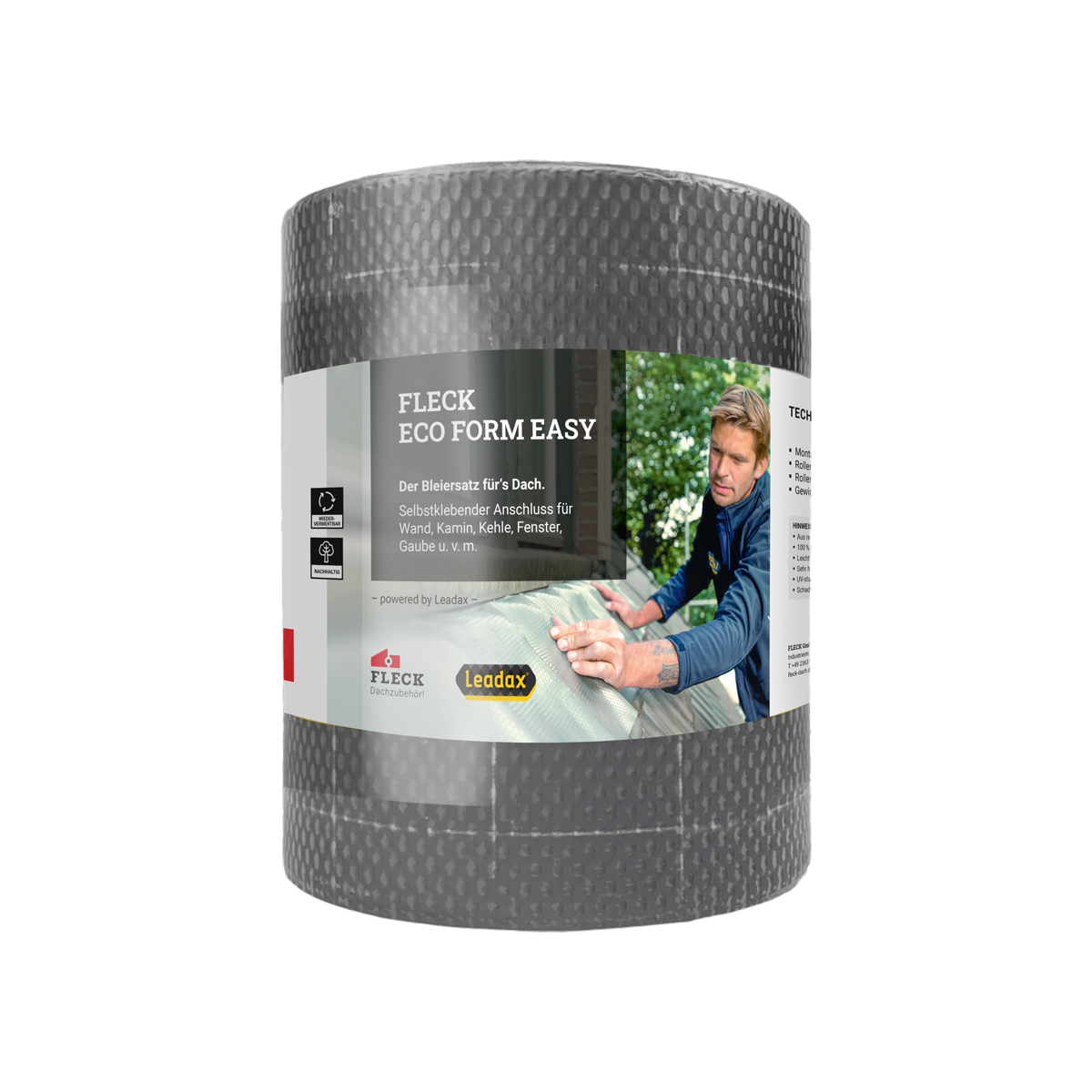 »Fleck Eco Form Easy« ist UV-stabil und sehr langlebig. Es hält in der Regel Witterungseinflüssen mindestens so lange stand wie alle anderen Werkstoffe an der Gebäudehülle. Deshalb kann es bedenkenlos mehrere Jahrzehnte auf dem Dach verbleiben. Wenn es doch zum Austausch des Produktes kommt, kann Leadax das Material zur Herstellung von neuem »Fleck Eco Form Easy« nutzen. Fleck bietet das Produkt in Form einer Rolle in den Farben Bleigrau, Schwarz und Ziegelrot an. Eine Rolle ist 5 m lang und 280 mm breit. J