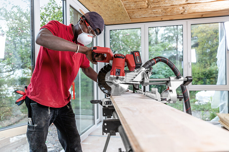 Bei Dachausbau, Renovierung und Sanierung sowie im Fassadenbau sind präzise Schnitte, saubere Winkel und Kanten gefragt. Gleichzeitig erfordern Arbeiten an Holzvertäfelungen, Sockel- und Abdeckleisten oder beim Ausbessern von Laminat und Parkett zügige Reihenschnitte. Für diese und vergleichbare Arbeiten biete sich die neue Kapp-Zug-Säge »SMS 190 18.0-EC« an, so Flex. Auch beim Aufbau von Holzständerwerken und Unterkonstruktionen sei sie geeignet. Die doppelte Zugführung mit Tiefenanschlag unterstützt ein sicheres passgenaues Arbeiten.