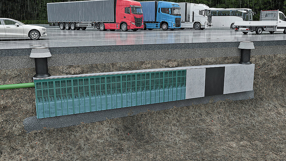 Grundelement für die gedichteten Anlagen sind die Rigolenfüllkörper »Rigofill inspect« von Fränkische: Die stabilen Kunststoffbehälter, die 95 Prozent ihres Volumens an Wasser aufnehmen, bilden ein modulares, flexibel anbaubares System unter der Erde. So lassen sich individuelle Konfigurationen in Länge, Breite sowie Höhe realisieren und auch komplexere Formen schnell und effizient realisieren. Für einen absolut dichten Speicher wird die Rigole in Spezialtechnik mit einer Kunststoff-Dichtungsbahn ummantelt. Dennoch bleibt der Speicherraum über den durchgängigen Inspektionstunnel für Kameratechnik komplett einsehbar. Dank der Belastungsklasse SLW 60 können die Anlagen unter Parkplätzen eingebaut werden und sind auch bei geringer Überdeckung voll befahrbar.