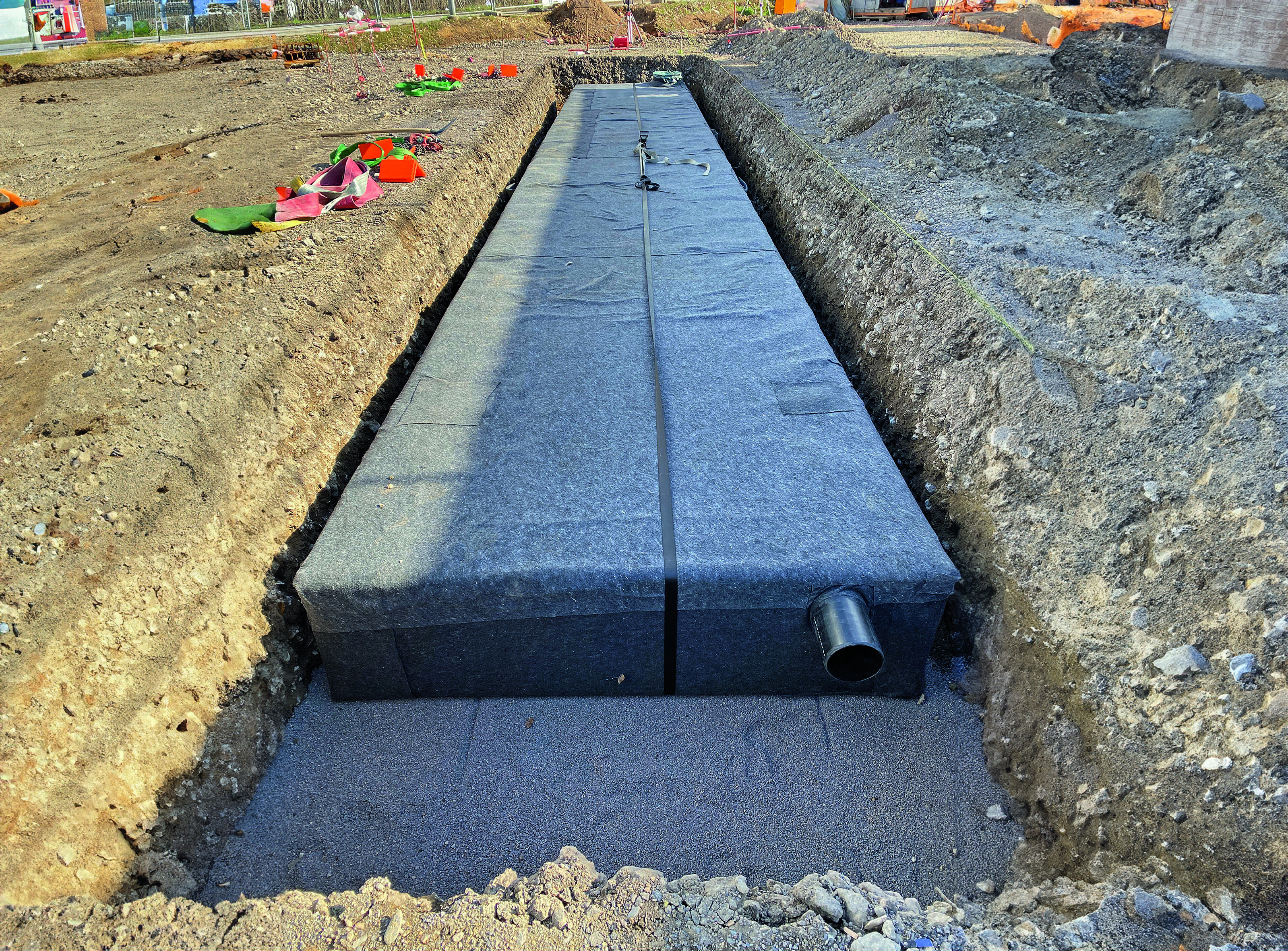 Ein ganzheitlicher, alternativer Service sind Werksrigolen: Folien Lücke fertigt die bestellte »RigoCollect«-Anlage direkt im Werk und liefert sie per Lkw just in time auf die Baustelle. Hier wird die »schlüsselfertige« Rigole in die vorbereitete Baugrube gesetzt, angeschlossen und verfüllt. »Mit diesem Rundum-sorglos-Paket agieren wir unabhängig vom Wetter und von Baustelleneinflüssen. Material muss nicht auf der Baustelle zwischengelagert werden, und auch die Einbauzeiten und der Geräteeinsatz reduzieren sich«, erläutert Tobias Elsing, Teamleiter Abteilung Regenwassermanagement bei Folien Lücke.