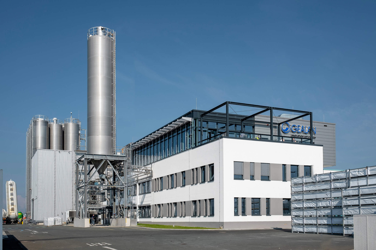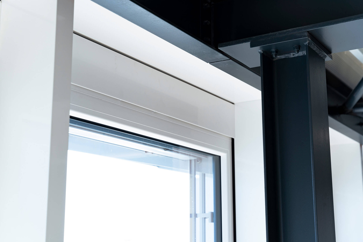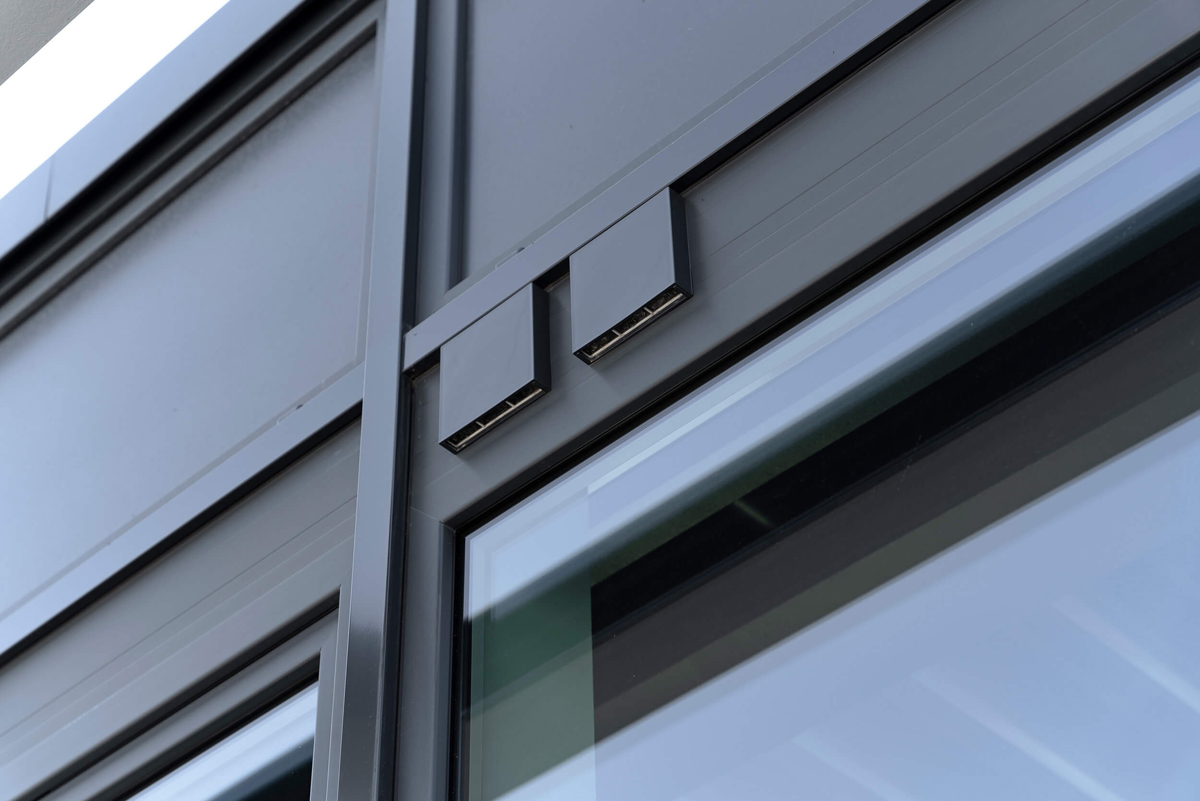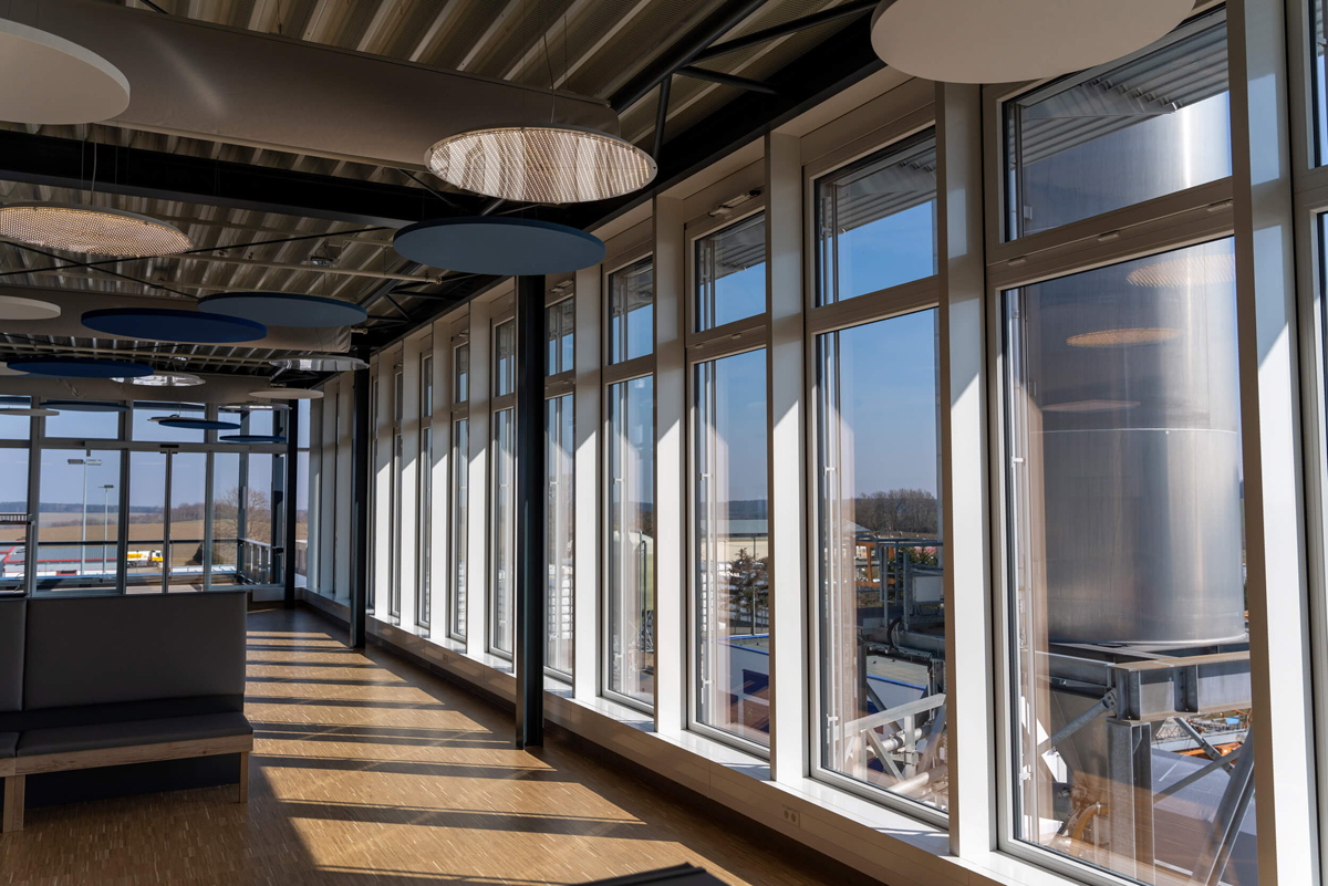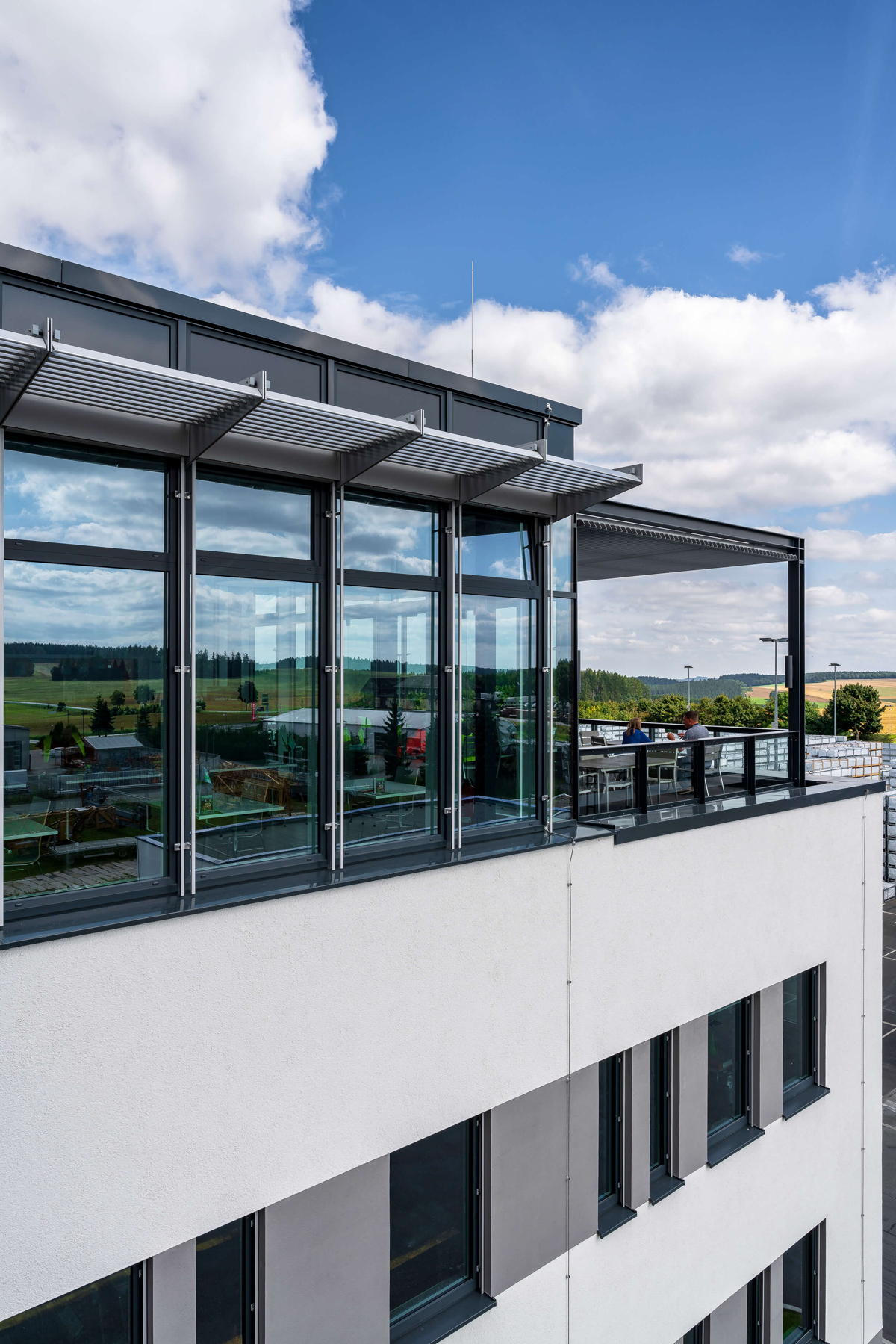 Die Glasfassade ist ein Hybrid aus Aluminium- und PVC-Elementen: Die Pfosten-Riegel-Konstruktion nimmt Wind- und Gebäudelasten auf und ist mit festverglasten PVC-Fenstern und Paneelen des Gealan-Systems S 9000 in Gealan-acrylcolor Anthrazitgrau ausgefacht. Der Neubau beherbergt Kantine, Lehrwerkstatt und Büros. Um vor allem die Kantine optimal zu belüften, wurde Gealan-caire smart installiert – das Lüftungssystem stellt vollautomatisch oder nutzergesteuert ideale Raumluftparameter her – und das aufgrund Wärmerückgewinnung energieeffizient. Durchdachte Fassadenarchitektur und höchste Ansprüche an Lüftung: im Kopfbau mit Köpfchen von Gealan komme beides zusammen.