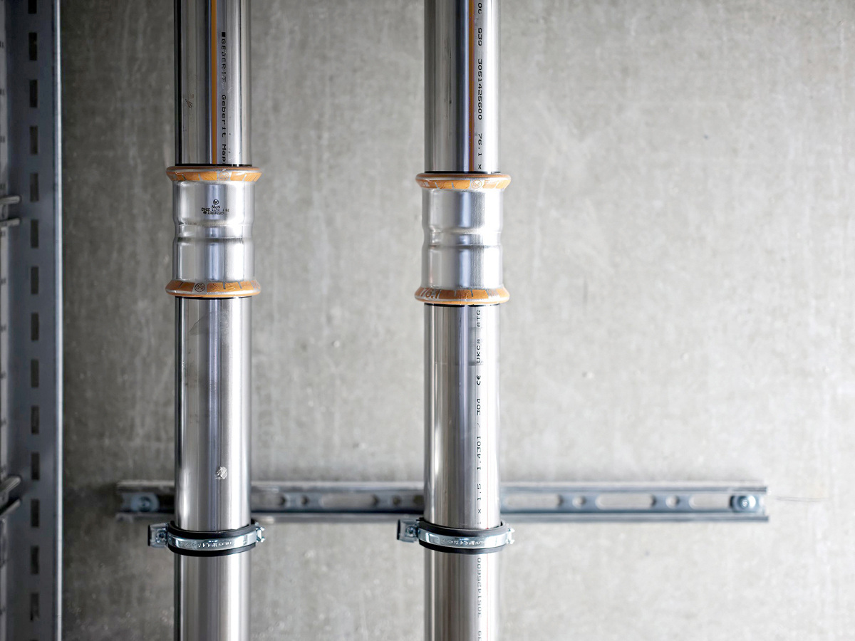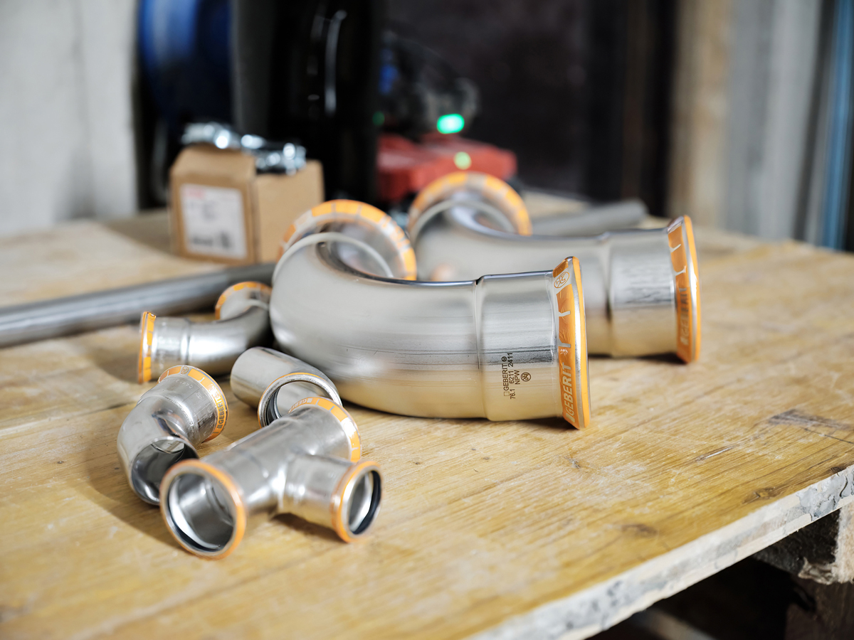 Umgesetzt wurde das Projekt mit dem neuen »Geberit Mapress Therm«. Das niedrig legierte Edelstahlpresssystem besteht aus CrTi Edelstahl 1.4520. Als wirtschaftliche und zugleich korrosionsbeständige Lösung eignet sie sich gut für Einsatzbereiche beim Heizen und Kühlen, bei denen mit Feuchtigkeitseinwirkungen von außen zu rechnen ist. Hauptanwendungsbereiche sind geschlossene Heiz- und Kühlkreisläufe mit und ohne Frostschutzmittel sowie Solar-, Fernwärme und Druckluftanwendungen. Das vielseitige System punktet insbesondere bei Anwendungen mit Temperaturdifferenzen und wird gleichermaßen in der Haus- und Gebäudetechnik sowie in industriellen Anwendungen und Wohnanlagen eingesetzt. Leon Walter erklärt: »Als nichtrostendes Rohrleitungssystem spielt das neue ›Mapress Therm‹ auch in der Unterputzverlegung seine Vorteile aus. Außerdem können wir auf bereits vorhandene Werkzeuge bei der Verarbeitung zurückgreifen und sind in der Anwendung erprobt.«