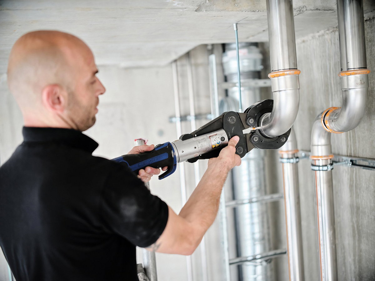 Danijel Pupic, Installateur beim Sanitärunternehmen Mergenthaler Zerweck, arbeitet schon seit Jahren mit verschiedenen »Geberit Mapress«-Systemen. Er schätzt die einfache Verarbeitung mit wenigen Werkzeugen sowie die hohe Sicherheit: Unverpresste Fittings werden durch die Pressindikatoren angezeigt, die erst nach der korrekten Verpressung leicht zu entfernen sind. Zudem sind durch den speziellen Konturdichtring nicht korrekt verpresste Verbindungen bei der Druckprüfung undicht und damit gut zu erkennen.