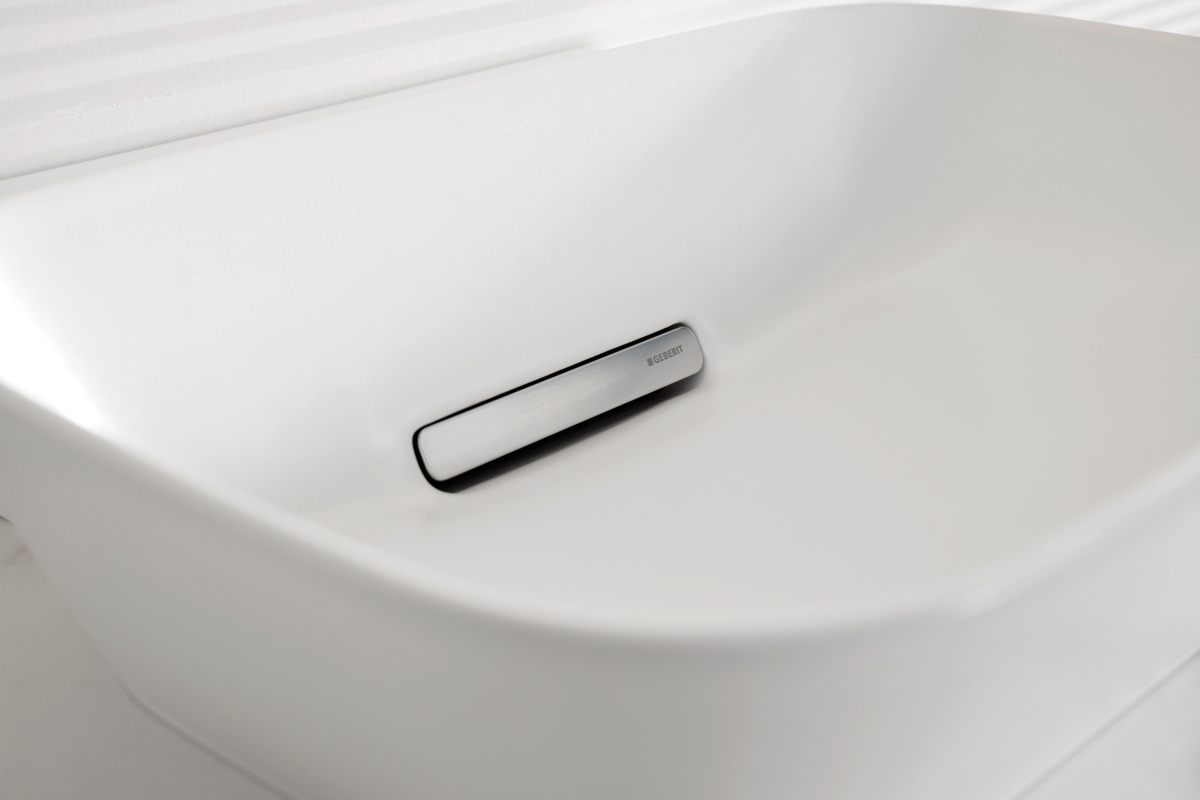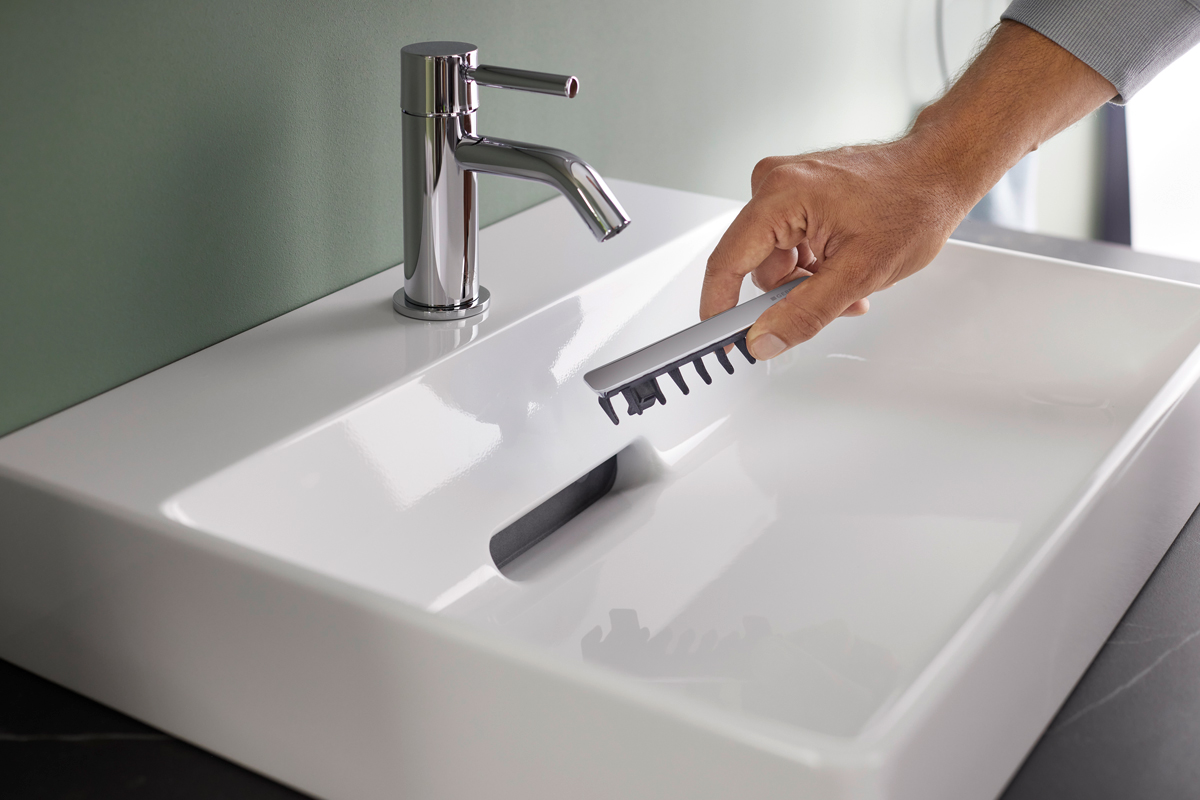 Sehen wir uns beispielsweise das Waschbecken hier an (»Geberit One« mit einem horizontalen »CleanDrain«-Ablauf): Normalerweise hätten wir in der Mitte einen runden Siphon, aus dem ich dann regelmäßig die langen Haare meiner Töchter herausholen muss. Das macht natürlich überhaupt keinen Spaß. Der »CleanDrain«-Ablauf von Geberit hat an der Rückseite einen Kamm, er ist magnetisch, ganz leicht rauszunehmen, ganz leicht zu reinigen. In anderen Waschbecken haben wir dann noch diesen Überlauf, bei dem man gar nicht wissen will, wie es dahinter aussieht. Dieses Waschbecken hat auch eine Überlauffunktion, aber sie ist unsichtbar versteckt. Das sind keine Dinge, die im Showroom den großen Wow-Effekt auslösen. Aber im täglichen Leben machen sie einen riesigen Unterschied.