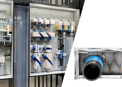 Auch das Entwässerungssystem sollte – analog zu Installations- und Versorgungssystem – aus dem Hause Geberit stammen. Die Wahl fiel auf das laut Geberit leicht zu verarbeitende System »Silent-db20«. Ob mit einer Elektromuffenschweißung, einer Spannverbindung oder mittels Spiegelschweißung – die »Silent-db20« Rohre und Formstücke lassen sich auf drei unterschiedliche Weisen sicher verbinden. Das bestätigt auch Projektleiter Florian Schneider von Alexander Ochs Wärmetechnik: »Durch das Verschweißen ist ›Silent-db20‹ extrem sicher. Außerdem erfüllt das Entwässerungssystem die Anforderungen an den Schallschutz ideal.«