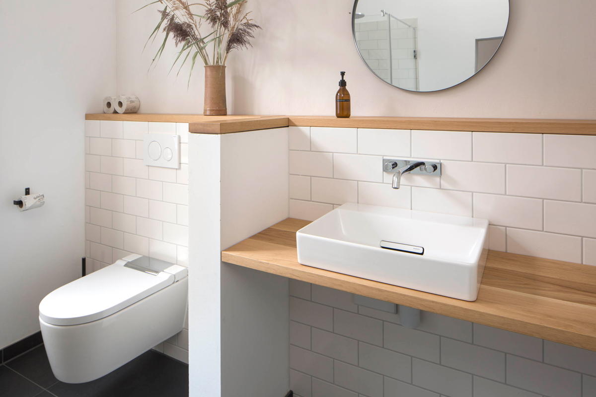 Im WC-Bereich entschieden sich die Bauherren für ein Dusch-WC als Luxus-Add-on, wie sie es selbst bezeichnen. Dabei fiel die Wahl auf das Modell AquaClean Sela von Geberit. „Wir wollten in unserem Gästehaus auf jeden Fall Dusch-WCs haben, da wir das Konzept sehr spannend finden: Unseren Gästen ermöglicht es das gewisse Extra an Luxus. Außerdem ist es nachhaltiger, da man bei der Benutzung weniger Toilettenpapier benötigt “, erklärt Kim Köster. Weiteres Plus: Das Dusch-WC bringe Gäste und Bewohner miteinander ins Gespräch, da viele diese Art von WC zuvor noch nicht kannten, nach der ersten Nutzung aber allesamt begeistert sind. „Wir finden es toll, unseren Gästen die Möglichkeit bieten zu können, das Dusch-WC hier für sich zu testen und auf diese Art etwas Neues kennenzulernen. Im Prinzip lässt sich dies auf das gesamte Projekt übertragen, das man ja auch als Testmöglichkeit für ein alternatives Lebens- und Arbeitsmodell betrachten kann“, sagt Niels Grugel.