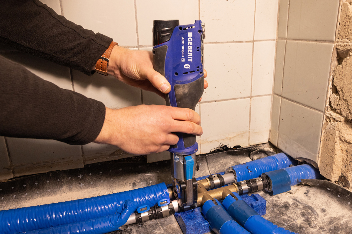 Die GebäudeTechnikSchultz GmbH setzte nach der Markteinführung 2021 als einer der ersten Betriebe im Raum Gifhorn-Wolfsburg im Bereich Kunststoff komplett auf das neue Versorgungssystem »Geberit FlowFit«. Kim Schultz würde sich heute – nach über zwei Jahren Dauereinsatz des Systems – immer wieder dafür entscheiden: »Alle Rohrdimensionen können mit nur zwei Pressbacken verpresst werden – die Umstellung auf ›Geberit FlowFit‹ war daher wirtschaftlich überschaubar. Alle unsere Fahrzeuge sind mit den entsprechenden Werkzeugen ausgestattet und das gesamte Team ist auf das System geschult. Auch die Anbindung an vorhandene Systeme ist dank der zahlreichen Übergänge kein Problem.« Die Vorteile gegenüber anderen Versorgungssystemen sieht Schultz vor allem in der schnellen und sicheren Installation: »Dank ›Geberit FlowFit‹ und der Vorfertigung der ›GIS‹ Elemente konnten wir die Rohinstallation einer Umkleidekabine in nur zwei Tagen umsetzen. Die Fittings zeigen an, wenn eine Pressung noch fehlt oder die Einstecktiefe noch nicht ideal ist. Außerdem ist das System auf Langlebigkeit ausgelegt.«