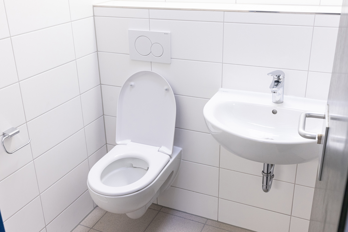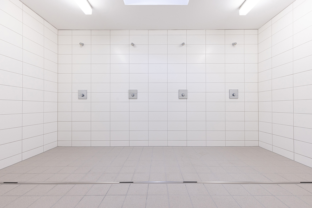 In den vier Duschräumen mit je sechs Duschen setzte Kim Schultz auf die Duschrinne »Geberit CleanLine80«. Sie leitet das Wasser über ein Rinnenprofil aus Edelstahl ab – ohne versteckte Bereiche, in denen sich Schmutz festsetzen oder unangenehme Gerüche entstehen können. Das Rinnenprofil hat eine »Easy-to-clean«-Beschichtung und ein integriertes Gefälle. Das macht die Duschrinne besonders reinigungsfreundlich. Um die Fliesenarbeiten zu erleichtern und die spätere Reinigung weiter zu vereinfachen, reihte Kim Schultz mehrere »CleanLine« Duschrinnen auf einer Länge von fünf Metern aneinander. Der Gefälleestrich konnte so gleichmäßig zur Rinne geleitet werden und die Fliesen sauber und ohne Stückelung verlegt werden. Ein echter Pluspunkt in Sachen Reinigungsfreundlichkeit insbesondere für öffentliche Gebäude. Bei den Toiletten entschied sich Schultz für WC- und Waschtischkeramiken aus der Badezimmerserie »Geberit Renova«. Die WCs sind spülrandlos, was eine einfache Reinigung ermöglicht, und bilden in Kombination mit den Geberit Unterputzspülkästen eine ideale Funktionseinheit.