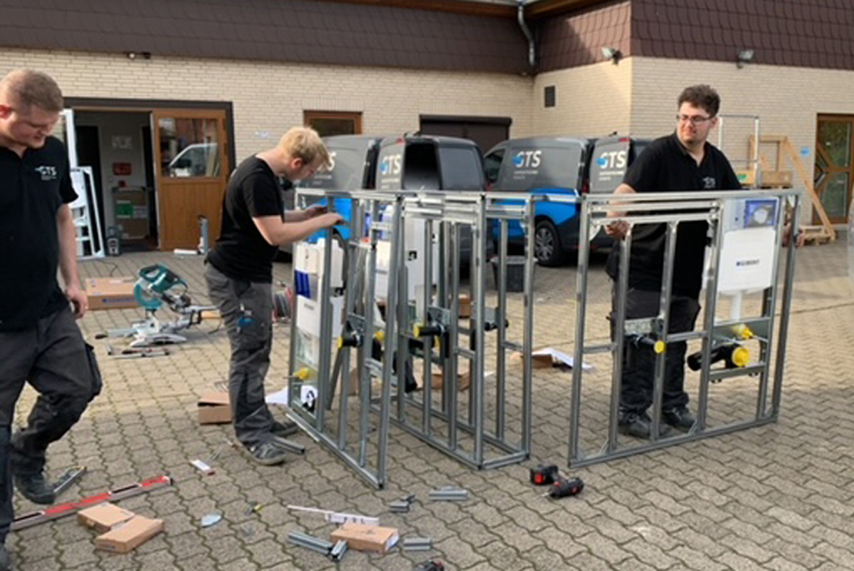 Im »Geberit ProPlanner« plante Kim Schultz neben der Leitungsführung auch die kompletten »GIS« Installationssysteme für die Turnhalle. Er übernahm die Stücklisten in die Bestellung und fertigte in der Werkstatt mit seinen Auszubildenen an nur einem Tag alle benötigten »GIS« Elemente für die Sporthalle Weyhausen vor. »Alle Pläne habe ich direkt aus dem ›Geberit ProPlanner‹ heruntergeladen und ausgedruckt. In der Werkstatt ging die Vorfertigung dann zügig voran, schließlich kommen die ›GIS‹ Komponenten ja schon in der entsprechenden Menge, sie lassen sich einfach zuschneiden und werkzeuglos zusammenstecken.« Auf der Baustelle erfolgte der Einbau des vorgefertigten »GIS« Tragwerks dann ebenso zügig wie die Trinkwasserinstallation mit »Geberit FlowFit«.