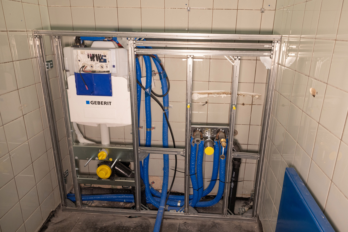 Die Grundrisse der Halle und der vier identischen Umkleidekabinen hat Kim Schultz in die Planungssoftware »Geberit ProPlanner« hochgeladen. Mit den Modulen erstellte er die gesamte Anlagenplanung: die Trinkwasser- und Abwasserinstallation ebenso wie das Installationssystem »Geberit GIS«. »Bei nahezu jedem Projekt arbeite ich mit dem ›Geberit ProPlanner‹, denn die Vorteile liegen auf der Hand: Effizienzsteigerung bei der Planung, Wirtschaftlichkeit durch wenig Verschnitt, ein geringes Fehlerpotential für meine Installateure und eine umfangreiche Anlagendokumentation mit Revisionsinformationen für mich und die Bauherren«, berichtet Kim Schultz. Die Software ist für ihn insbesondere dann eine optimale Lösung, wenn er vor und hinter der Wand konsequent auf die Lösungen von Geberit setzt: »Ich bleibe gerne bei einem System und setze seit meiner Ausbildung auf Geberit. Die Produkte sind für Handwerker gemacht und das zahlt sich vor allem bei der Installation und der Planung aus. Zudem macht die Abstimmung von Installations- und Rohrleitungssystem, Spülkästen und Sanitärausstattung vor der Wand einfach Sinn, denn alles greift nahtlos ineinander.« Bei der Planung und Bemusterung hatte Kim Schultz weitgehend freie Hand. Der Bauherr wünschte sich lediglich barrierefreie Duschen und selbstschließende Armaturen, um unnötiges Wasserlaufen zu verhindern, sowie den Austausch der kompletten Versorgungsleitungen.
