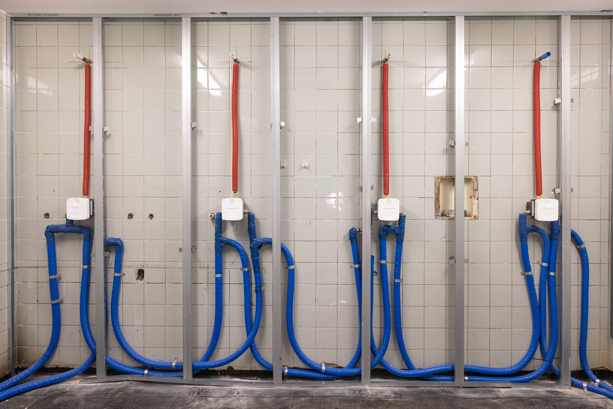 »Der Wasserschaden hat den Weg bereitet, die gesamte Technik aus den 1970er Jahren in die Neuzeit zu katapultieren«, fasst Kim Schultz, Geschäftsführer der GebäudeTechnikSchultz GmbH, die Sanierung zusammen und ergänzt: »Sicherheit, Hygiene und Brandschutz waren die zentralen Leitpunkte der Anlagenkonzeption. Wir haben dabei vor und hinter der Wand konsequent auf die Systeme von Geberit gesetzt und konnten im Montage- und Planungsprozess die Vorteile der ideal aufeinander abgestimmten Produkte voll ausschöpfen.«