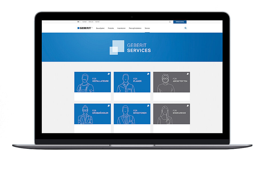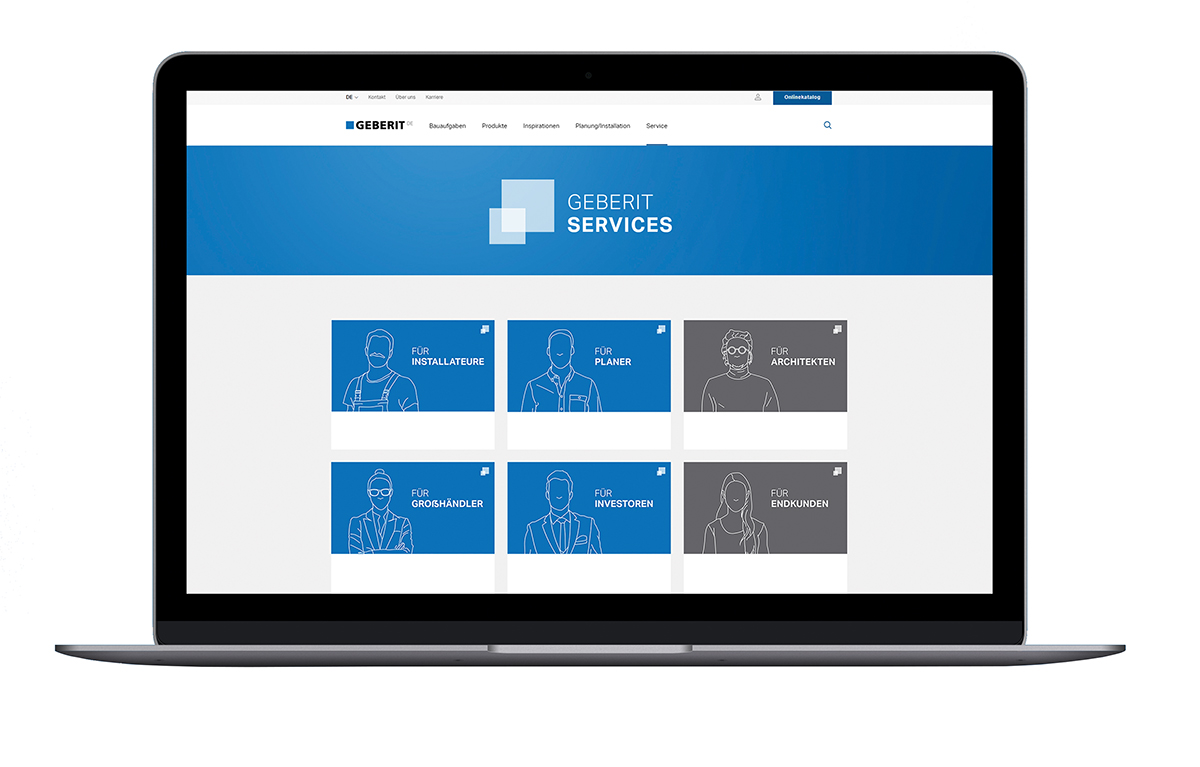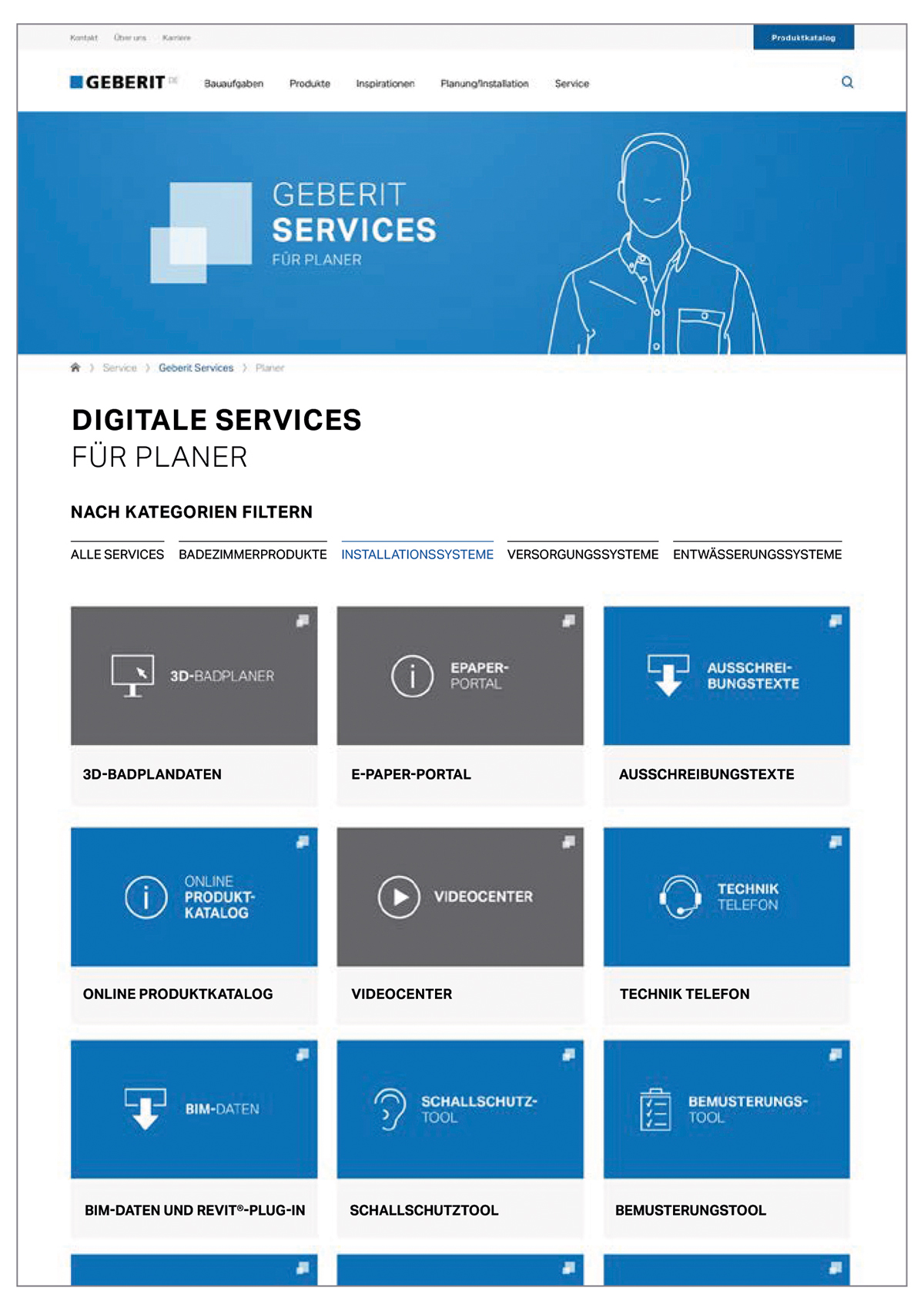 Passend zu den angebotenen Produktlösungen finden sich im Geberit Serviceportal über 60 Services in den vier Kategorien Badezimmerprodukte, Installationssysteme, Versorgungssysteme und Entwässerungssysteme.