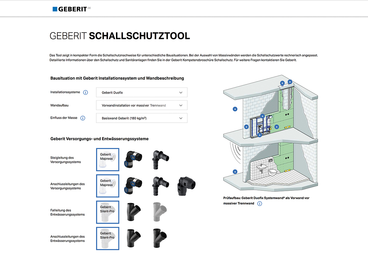 Im Bereich Entwässerungssysteme finden Installateure und Planer beispielsweise das Geberit Schallschutztool. Damit lassen sich für spezifische Bausituationen Lösungen finden, die einen idealen Schallschutz ermöglichen.