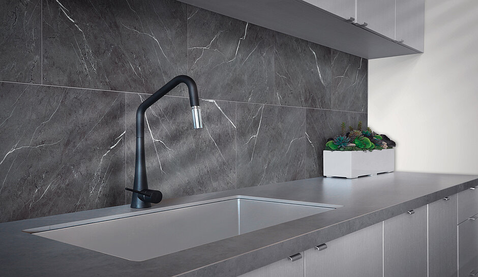 Die Wandverkleidungen »Mural Revela« sind als Fliesen (65 x 37,5 x 0,5 cm), als XL-Paneele (90 x 260 x 0,5 cm) sowie in vier verschiedenen Designs auch als XXL-Paneele im Format 120 x 260 cm erhältlich. Aufgrund des speziellen Polyurethan-Oberflächenschutzes sind sie sehr strapazierfähig sowie leicht zu reinigen. Dank der großen Auswahl ästhetischer und ultrarealistischer Dekore mit Stein-, Zement- oder Marmoroptiken bietet die Kollektion für jeden Einrichtungsstil eine passende Lösung. Abgerundet wird das moderne Erscheinungsbild von »Mural Revela« durch eine extraschmale Fuge sowie optional erhältliche Aluminiumprofile für einen optisch stimmigen Wandabschluss. Für maximale Gestaltungsfreiheit lassen sich sowohl die drei Formate als auch alle Farben nach dem praktischen Mix-and-Match-Prinzip flexibel kombinieren.