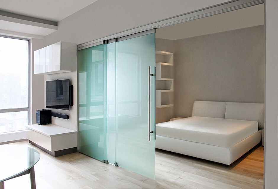 Die Nutzung der Schiebetürsysteme wird durch einen geräuscharmen Lauf sowie die optionale Dämpfung durch eine Softstop-Funktion erleichtert. Wird die örtliche Führung im Randbereich gesetzt, ist auch ein barrierefreier Durchgang umsetzbar. Um unerwünschte Einblicke zu verhindern oder auf optische Akzente zu setzen, lässt sich die Glasoberfläche beliebig bearbeiten. J