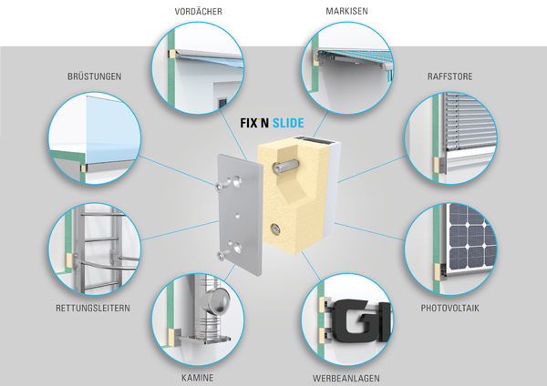 »Fix’n Slide« ist laut Herstellerangaben für Neu- und Bestandsbauten gleichermaßen geeignet und erfüllt die Kriterien der EnEV 2016. Durch die Zug-, Abscher- und Momenteneinleitungen sind unterschiedlichste Anwendungen möglich. Ob Kamine oder Rettungsleitern, Brüstungen oder Vordächer, Markisen oder Raffstores, Photovoltaikmodule oder Werbeanlagen – »Fix’n Slide« kann demnach vertikal und horizontal montiert werden und lässt sich für Anbauelemente nahezu aller Hersteller sicher verwenden.