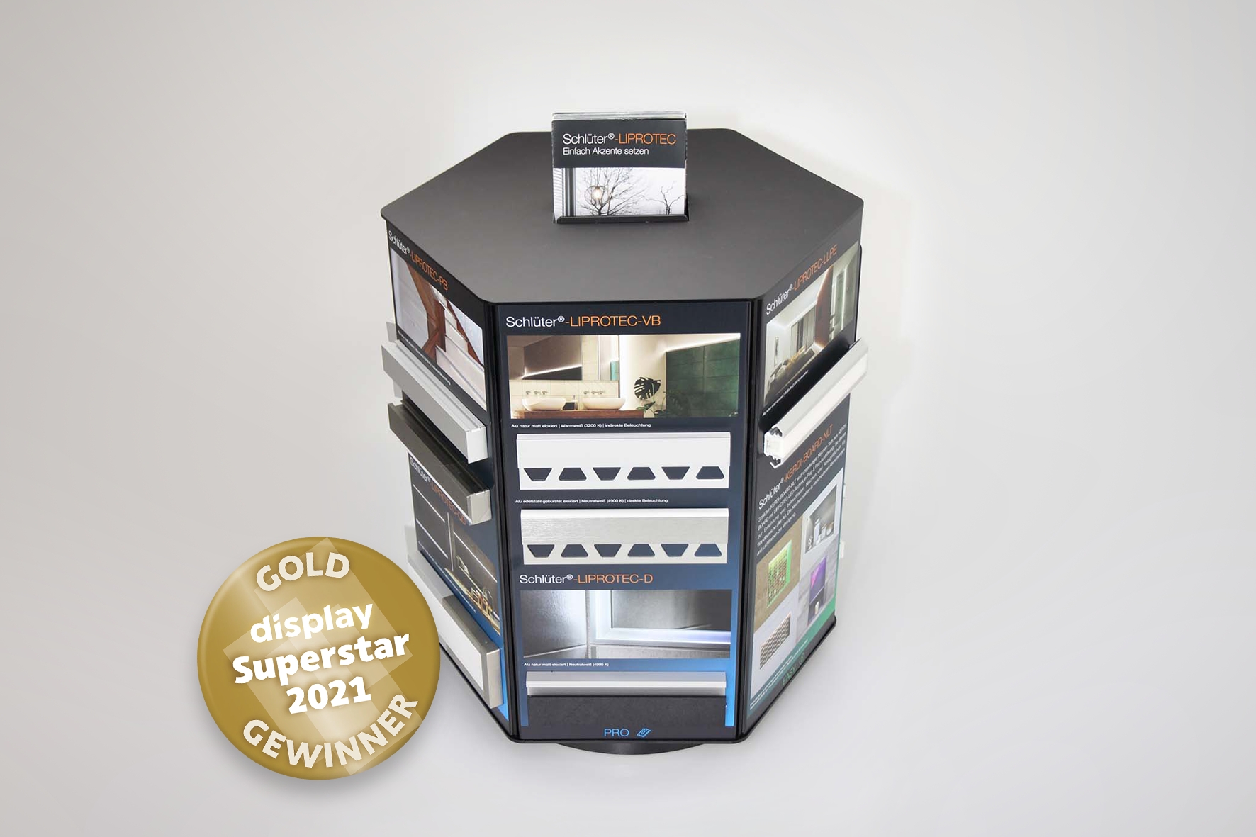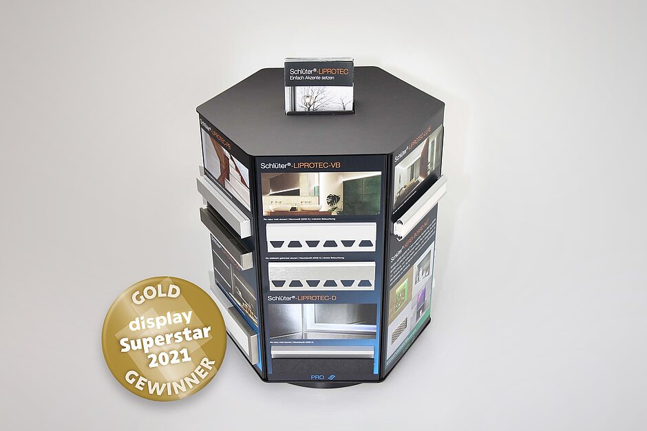 Das von der andres GmbH gefertigte Funktionsmodell für die LichtProfilTechnik Schlüter-LIPROTEC hat den „display Superstar Award“ 2021 in Gold gewonnen. Der vom POS-Fachmagazin display ins Leben gerufene Preis wurde Ende Oktober im Rahmen einer feierlichen Gala verliehen. Das Funktionsmodell für den Fachhandel zeigt die unterschiedlichen Produktlinien der LichtProfilTechnik und visualisiert anschaulich ihre Einsatzmöglichkeiten. Die elegante schwarze Optik unterstreich dabei die Wertigkeit der Profile und lässt die unterschiedlichen Lichtfarben, die per Fernbedienung anwählbar sind, besonders zur Geltung kommen. Kombiniert mit seiner außergewöhnlichen hexagonalen Form setzt das Modell ein eindrückliches Markenstatement am Point of Sale.