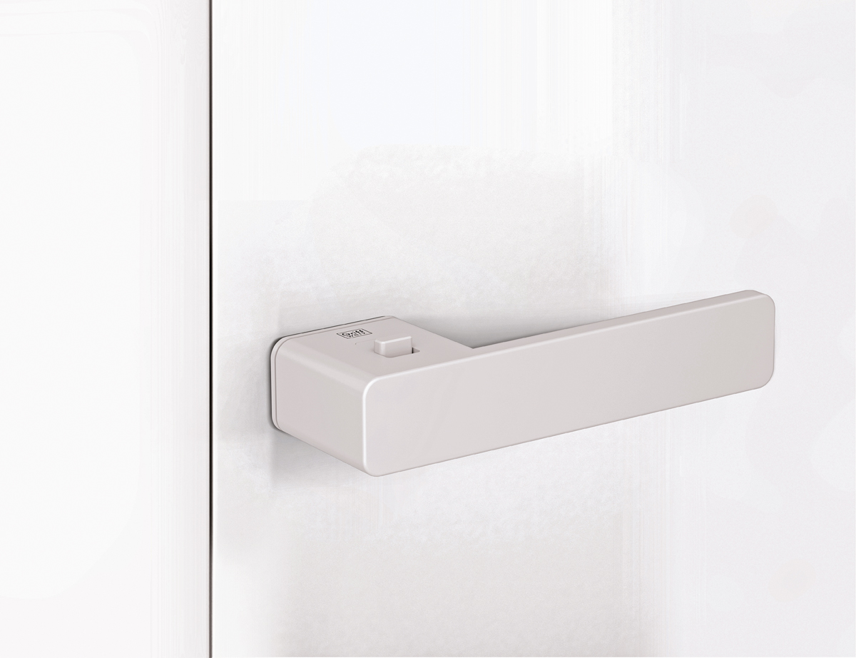 Auf Rosetten wird bei den Türgriffen ganz verzichtet. Das Design ist geometrisch klar, die Rückseite weich gerundet für eine angenehme Haptik. Komfort bietet die Schließtechnik »smart2lock by Griffwerk«: Innentüren können mit nur einer Hand geschlossen und auch abgeschlossen werden. Der integrierte Verschlussriegel liegt dezent in Daumenreichweite. Strom wird nicht benötigt. Die Technik basiert nach Unternehmensangaben auf langlebiger Mechanik. Konventionelle Buntbartschlüssel sowie störende Schließrosetten oder WC-Riegel sind ebenfalls überflüssig. So entsteht laut Hersteller eine neue, puristische Türenästhetik. Die schlichte Präsenz des Griffs passt auf Standardtüren, aber auch auf ungewöhnliche Türlösungen wie beispielsweise zargenlose, flächenbündige Tapetentüren.