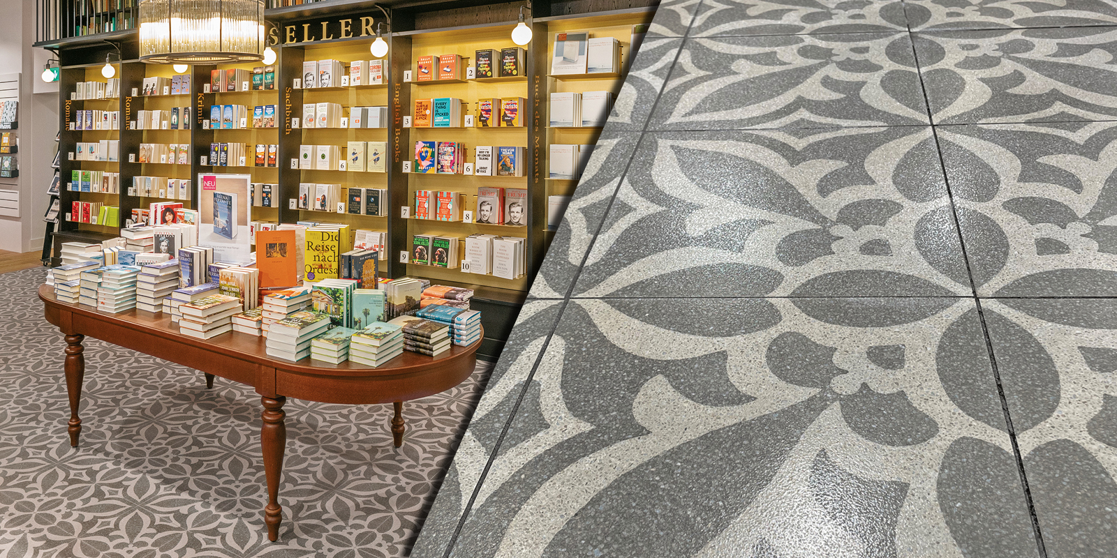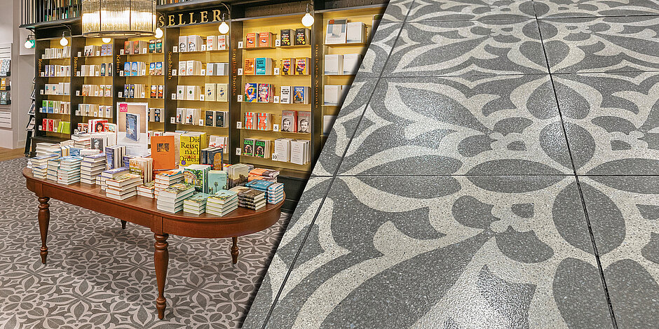 Bei der Sanierung im Kramhof kamen unterschiedliche Materialien und Farben zum Einsatz. »Das Feeling ist gemütlich und nostalgisch, das Ladenlayout ist sehr speziell – sowohl traditionell als auch modern«, schwärmt Filialleiterin Sabine Haarmann. Die Buchhandlung ist hochfrequentiert: Rund 2 000 Besucher zählt man täglich. Im offen gestalteten Eingangsbereich wurde ein mit hellgrauen Ornamenten verzierter Keramikboden verlegt.