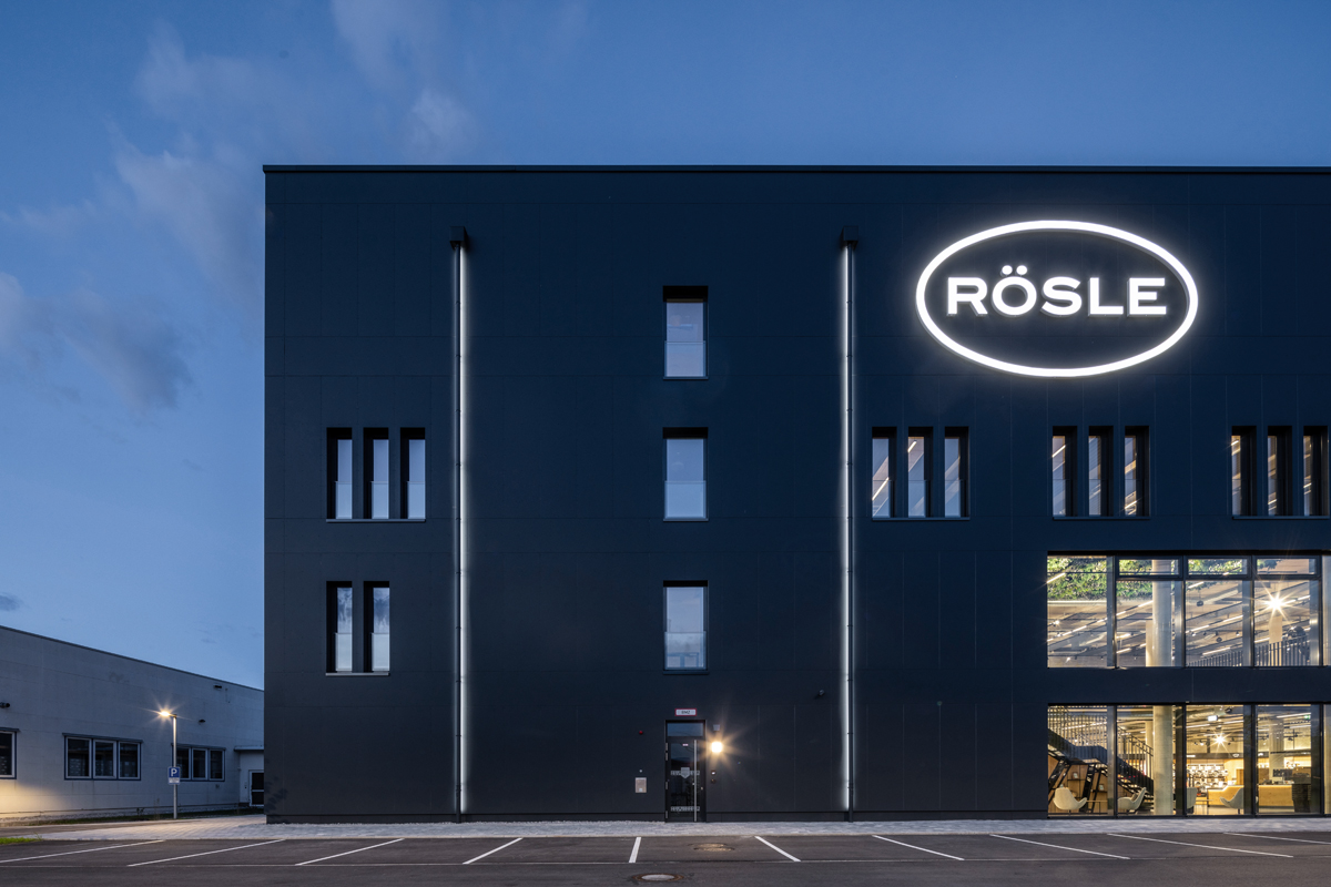 Auf über 3000 m² entstand bei der Firma Rösle ein vielseitig nutzbarer Neubau: ein modernes Logistikzentrum mit einem direkt angeschlossenen Outlet-Store von 800 m² sowie einer großzügigen Kochschule mit weiteren 400 m² Fläche. Beim Bau entschied man sich bei der Dachentwässerung bewusst für die außenliegende Attikaentwässerung. Die Planung und Realisierung des neuen LED-Beleuchtungssystems wurde gewerkübergreifend umgesetzt: In enger Abstimmung arbeiteten die Firma Gebler, verantwortlich für Spengler- und Dachdeckerarbeiten, und die Firma Minck, die die moderne Beleuchtungstechnik installierte und intelligent in die Gebäudesteuerung integrierte, Hand in Hand.