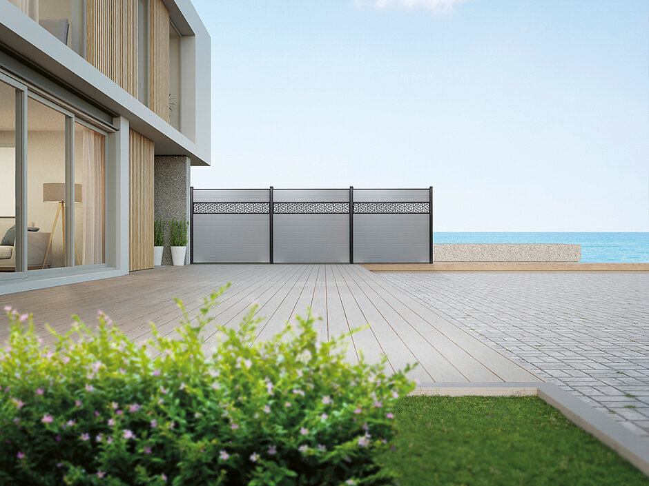 Der Schwerpunkt der GroJa-Messepräsentation liegt auf aktuellen Modellen aus dem Wind- und Sichtschutzprogramm von GroJa. Zu sehen gibt es beispielsweise die neuen Varianten »Schmal« und »Premium« des Steckzaunsystems aus langlebigem PVC, der »GroJaBasicLine«. Die neue Version »Schmal« besteht pro Zaunelement aus zwölf Füllungen mit einer Breite von je 15 cm statt wie bisher aus sechs, je 30 cm breiten Füllungen. Die Variante »Premium« wiederum hebt die Gestaltungsmöglichkeiten mit dem PVC-Steckzaun auf ein neues Niveau. Zwischen den Elementen werden schmale, farblich abgesetzte Aluminiumstreben integriert. Diese sogenannten Lisenen gliedern die Zaunfläche optisch und verleihen dem Zaun eine besonders edle Optik.