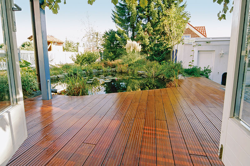 Für vernünftige Pflege der Terrasse bieten sich viele verschiedene Produkte an. Sinnvoll sind hierbei vor allem Terrassen-Reiniger, Entgrauer und farbige Terrassen-Öle, Oberflächliche Verschmutzungen lassen sich laut Osmo gut mit dem hauseigenen »Holzterrassen-Reiniger« entfernen, dazu wird das Mittel mit Wasser verdünnt, entlang der Maserung aufgetragen und nach gründlichem Schrubben mit klarem Wasser nachgespült.