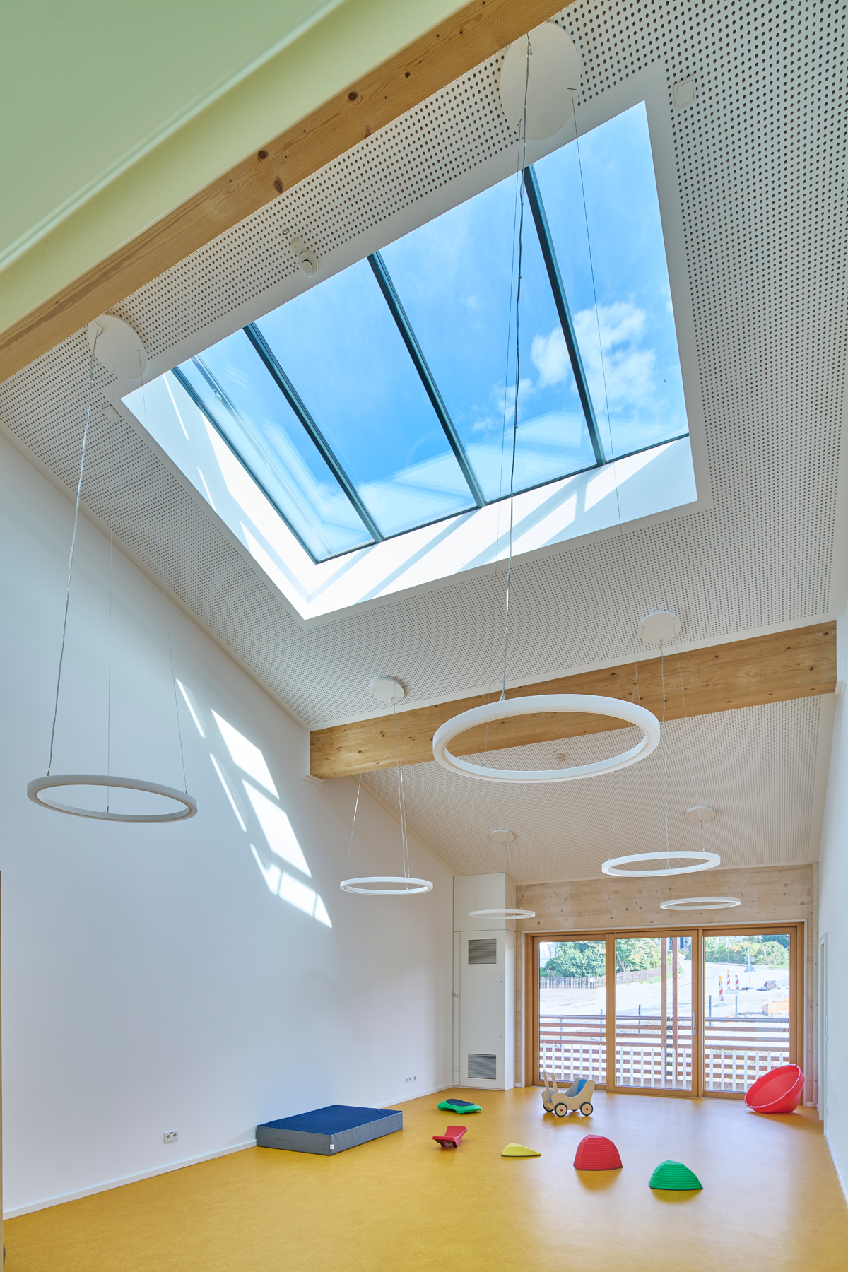 Das Architekturbüro PP+ war bereits aus anderen Projekten mit den Lösungen von Glasolux gut vertraut. Daher lag die Empfehlung nahe, den Hersteller aus Bielefeld auch bei der Kita am Mareisring einzubinden und dessen Kompetenz für Dachverglasungen zu nutzen. Glasolux kalkulierte zunächst sieben Lichtbänder; zwei weitere kamen im Laufe der Planungen hinzu. Auf einer Seite des Daches verteilen sich fünf Lichtbänder mit einer Breite von 3,32 m. Jedes dieser Lichtbänder verfügt über zwei Öffnungsflügel für die Frischluftzufuhr. Insgesamt vier Lichtbänder mit einer Breite von jeweils 4,46 m sind auf der anderen Dachseite installiert und von den PV-Modulen umgeben. Alle Fenster sind innen und außen in der Farbe Anthrazit sowie mit Sonnenschutzmarkisen ausgeführt.