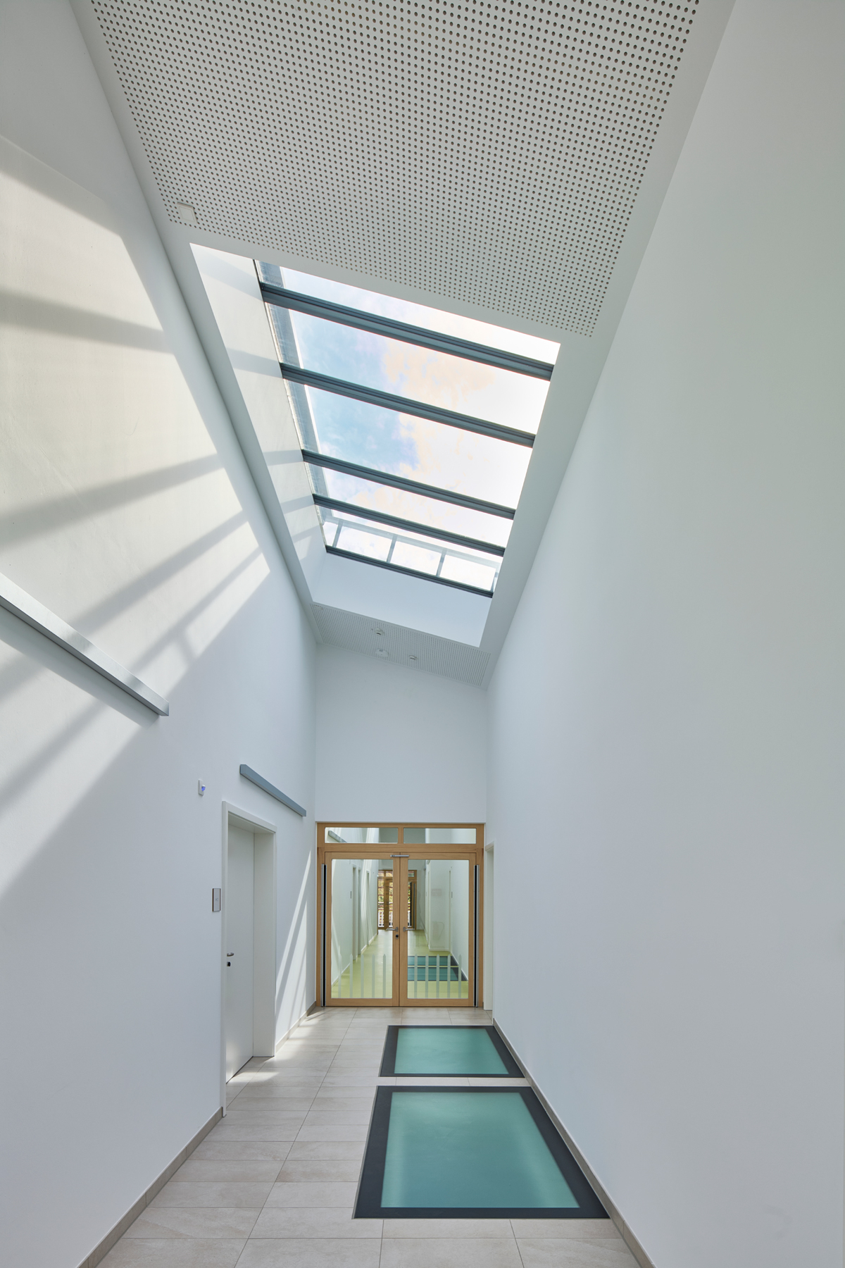 Mit eigenem Personal montierte Glasolux die Lichtbänder – wie auch die begehbaren Oberlichter im Innern. Deren Aufgabe besteht darin, möglichst viel Tageslicht, das durch die Lichtbänder ins Obergeschoss fällt, in das Erdgeschoss weiterzuleiten. Sie wurden in den Korridorböden des Obergeschosses installiert.