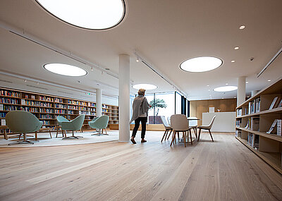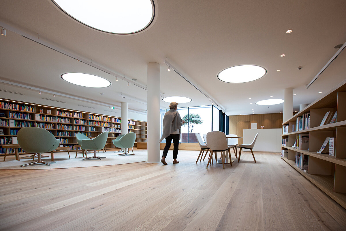 Außenflächen durch den Einsatz von begehbaren Fenstern eine besondere Note zu verleihen, folgt laut Marco Lehmkühler ohnehin einem immer stärker werdenden Trend. Beispielhaft steht hierfür das Work-Café der Bertelsmann Stiftung in Gütersloh. Es verbindet den Innenhof mit fünf Pavillons und befindet sich oberhalb der Bibliothek. Sechs »Circular Walk-Ons« versorgen diese mit Tageslicht, während der Freiraum darüber ein gern angenommener Treffpunkt ist.