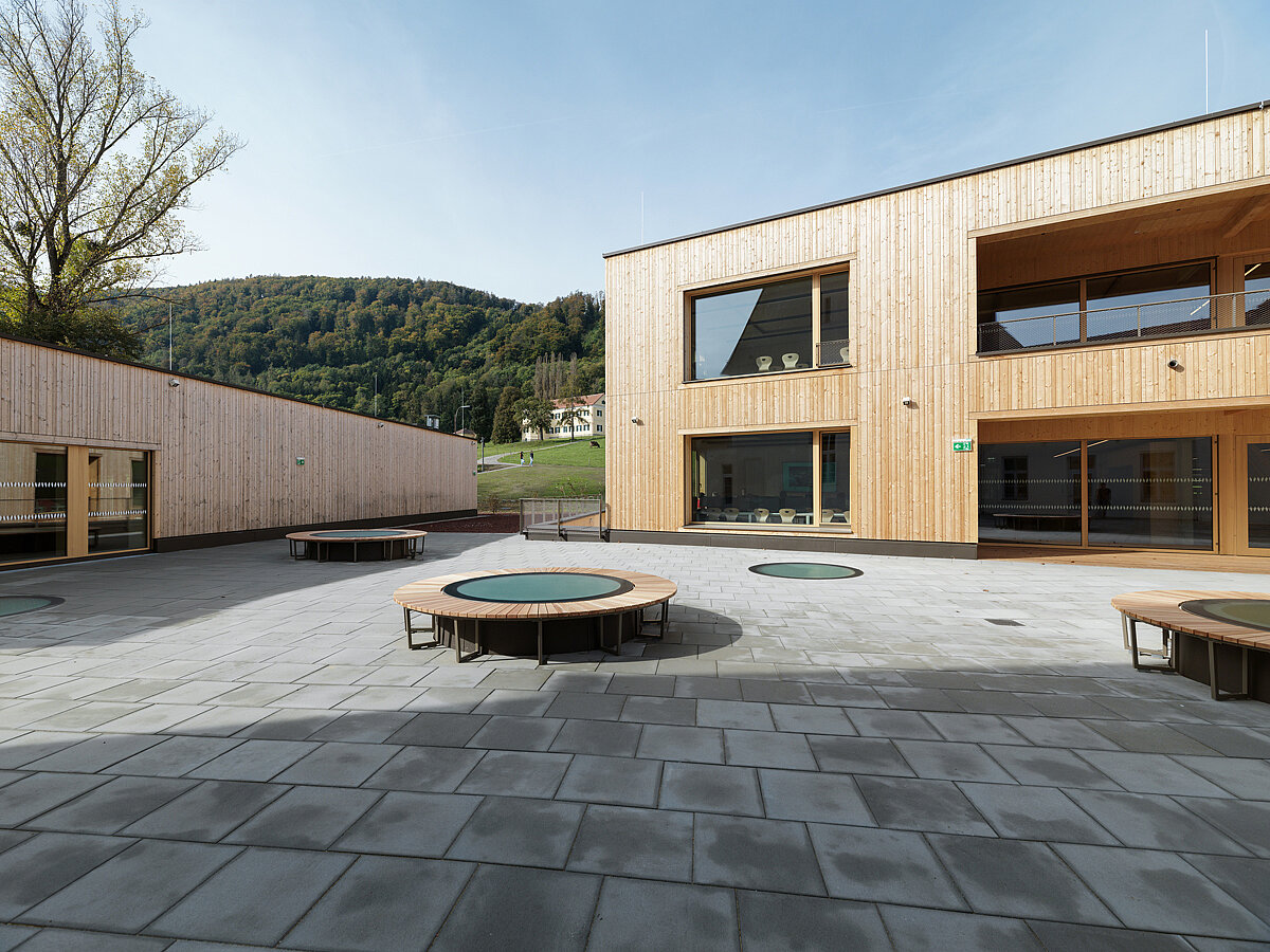 Letzteres ist eine gern gewählte Option, wenn Flachdächer zunehmend als zusätzlicher Bewegungs- und Begegnungsraum genutzt werden. Ein Beispiel hierfür ist die Landwirtschaftliche Fachschule (LFS) Grottenhof im österreichischen Graz. Drei runde Glasolux-Oberlichter wurden dort ebenerdig eingebaut. Drei weitere wurden erhöht und mit Sitzgelegenheiten umgeben. So tragen die mit Dreifach-Isoliergläsern und Aluminiumrahmen in Beigegrau ausgeführten Oberlichter in Graz zum Austausch und Entspannen bei.