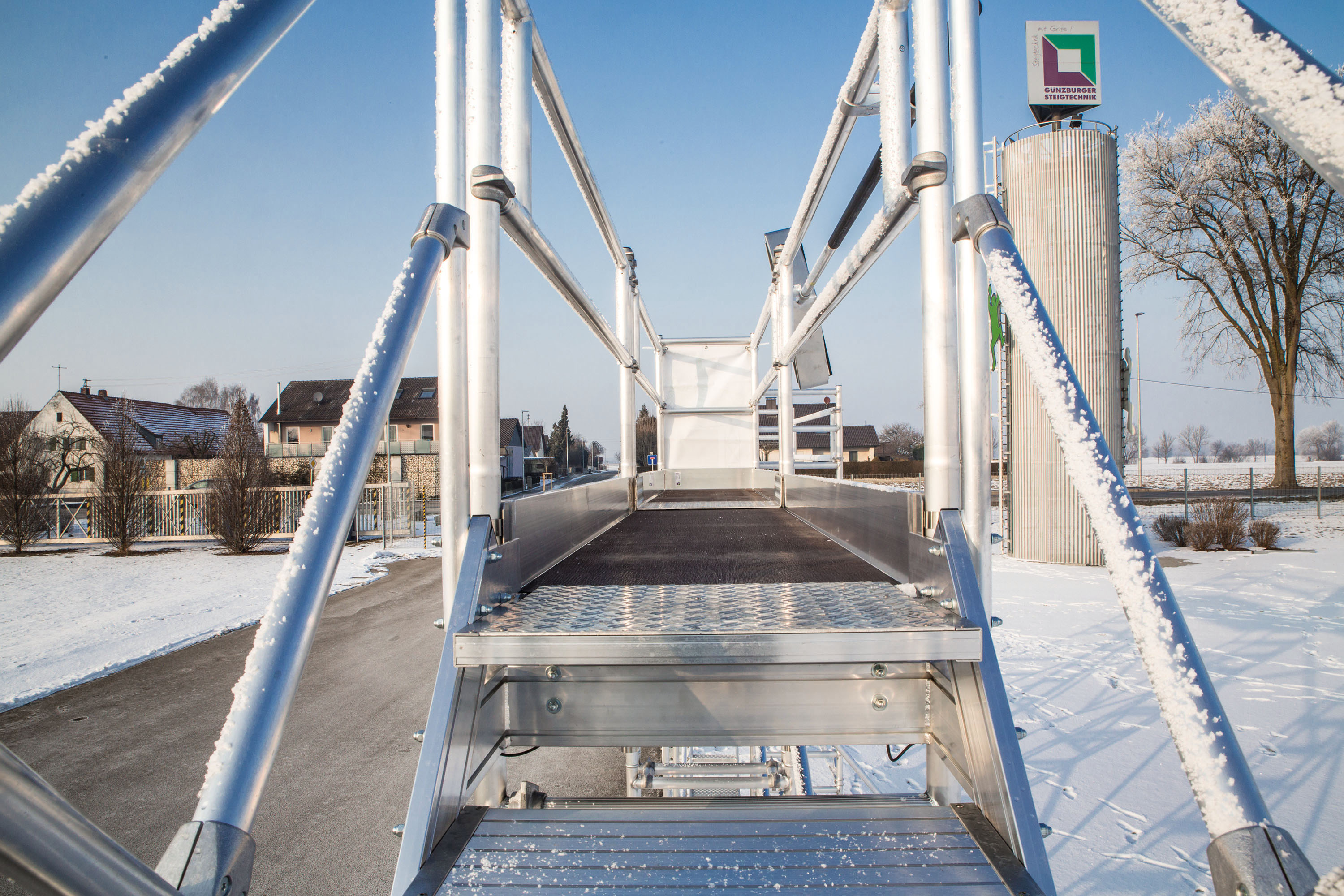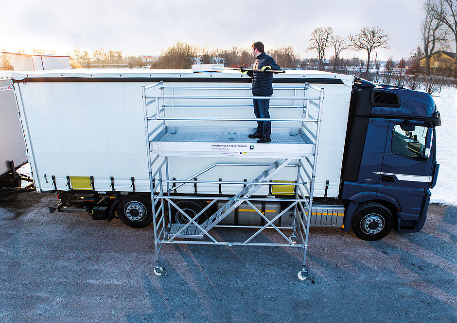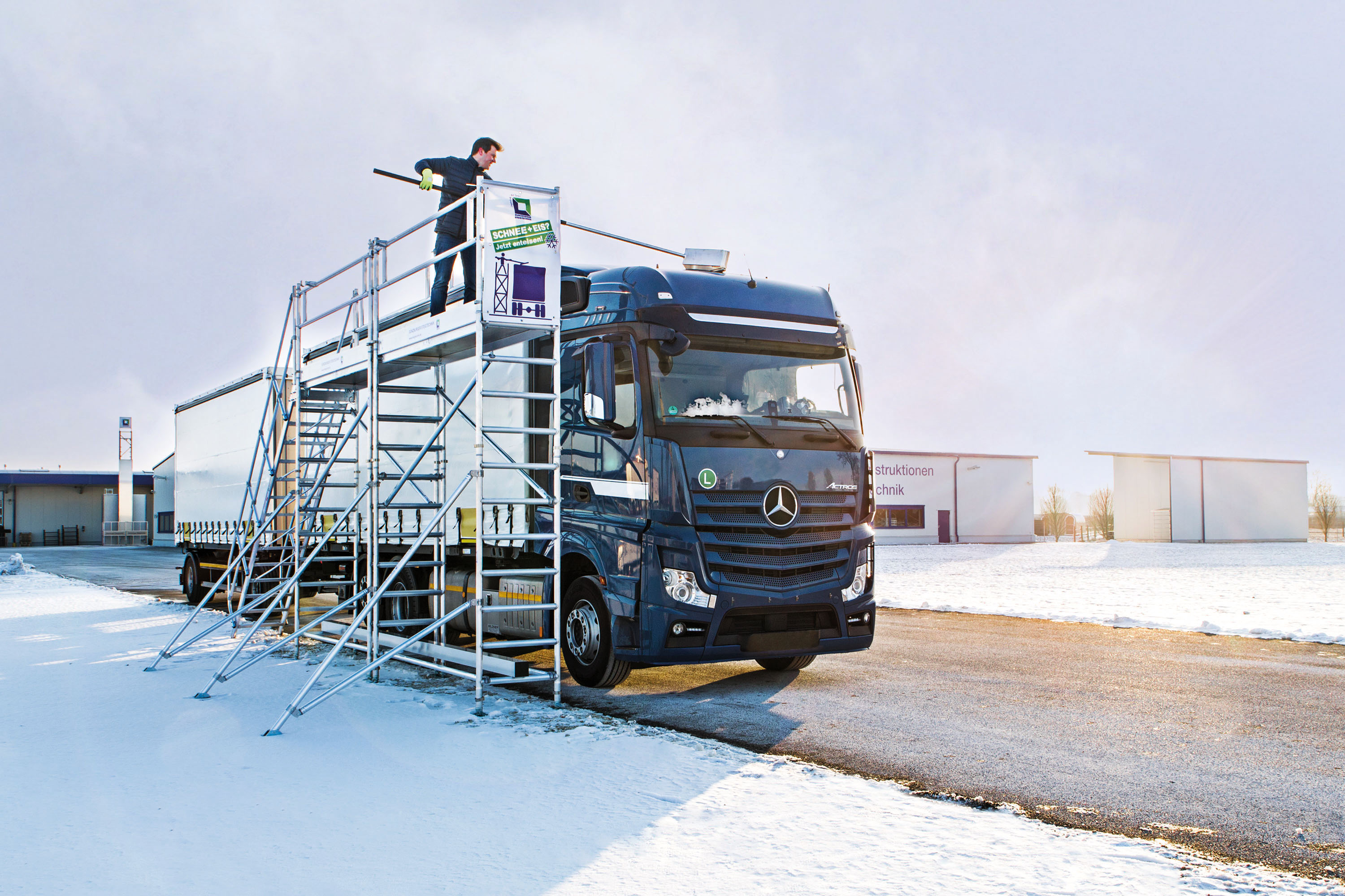Die Enteisungsanlagen und -gerüste der Munk Günzburger Steigtechnik können das ganze Jahr über aufgebaut bleiben, sie sind absolut witterungsbeständig und wartungsfrei. „So können sie auch im Sommer genutzt werden, beispielsweise für Reparaturen an der Lkw-Plane oder dem Dach“, erklärt Ferdinand Munk. Die Konstruktionen gehören zum Standardprogramm des bayerischen Herstellers, was eine schnelle Lieferung innerhalb von vier Wochen ermögliche.