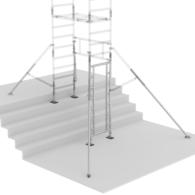 Mit dem neuen Treppenkit wird der FlexxTower auch zum Mutlitalent in Treppenhäusern sowie auf Stufenabsätzen und lässt sich dank des Erweiterungssets einfach und schnell für diesen Einsatz rüsten. Neu ist auch die Variante FlexxTower SG – mit vorlaufenden Geländern – für noch mehr Sicherheit beim Auf- und Abbau des Gerüsts.