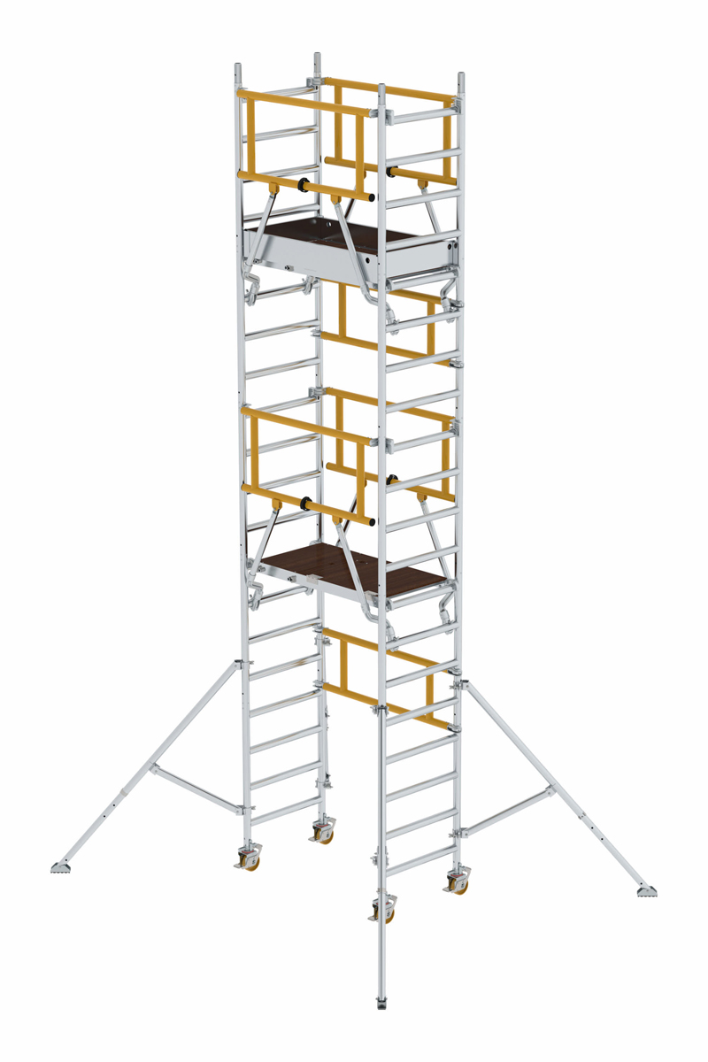 Für ein Höchstmaß an Stabilität sorgen beim FlexxTower teleskopierbare Dreiecksauslager, die mit Schwenkfüßen ausgestattet sind. Sie sind stufenlos an den Rahmenrohren des Gerüsts verstellbar. Unebene Untergründe lassen sich außerdem über höhenverstellbare Lenkrollen ausgleichen.
