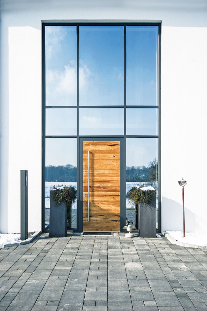 Die Aluminium-Holztüren gibt es wahlweise in klassischer heller Eiche-Altholz-Oberfläche (Modell »Aarau«) oder progressiver dunkel-gedämpfter Eiche-Altholz-Variante (Modell »Aarburg«), die bereits auf der Fensterbau Frontale Premiere feierte.