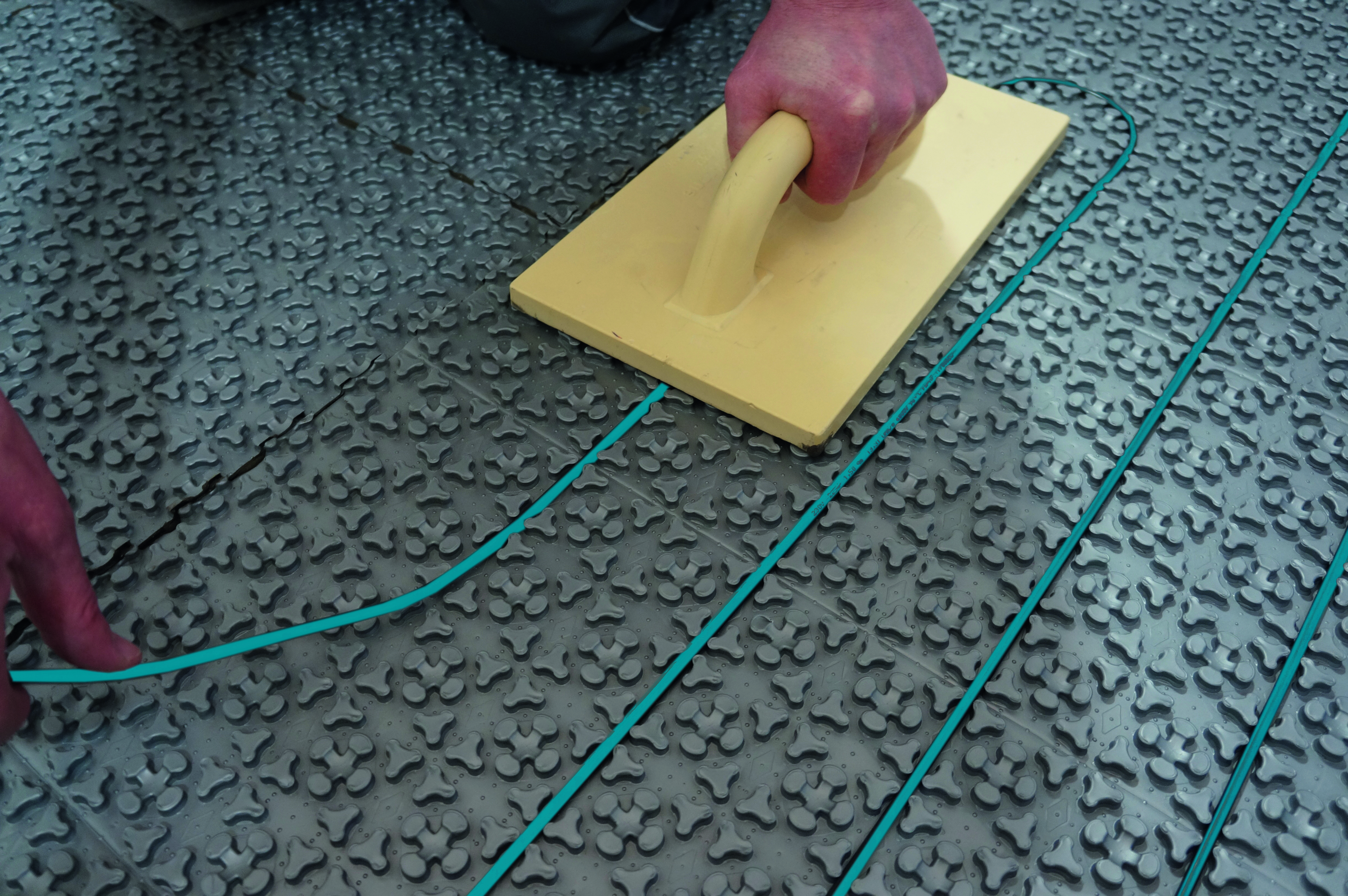 Auch die Verlegung ist einfach. Die Gutjahr-Fußbodenheizung liegt sofort plan und lässt sich deshalb problemlos auf dem Untergrund verkleben. Die Heizkabel haben bei jeder Länge denselben Querschnitt. Dadurch rasten sie präzise ein, es gibt keine Knicke im Heizkabel – das vermeidet einen Hitzestau. Zudem ermöglicht sie aufgrund ihrer offenen Struktur ein schnelles Ausspachteln mit Fliesenkleber oder Spachtelmassen.