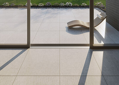 TerraMaxx TSL ist auch deswegen für die Verlegung von Großformaten ideal, weil es die hochwertige Optik unterstützt. „Wer sich für Großformate entscheidet, möchte in der Regel keine breiten Fugen, die die durchgehende Optik stören. Dank der schmalen Fugenkreuze sind deshalb bei der Verlegung auf dem Gutjahr-Trocken-Stelzlager Fugen von nur 2 mm Breite möglich“, so Ralph Johann. Hinzu kommt: Die Fugen können sogar geschlossen ausgeführt werden: mit dem Spezial-Fugenfüllstoff MorTec SOFT.