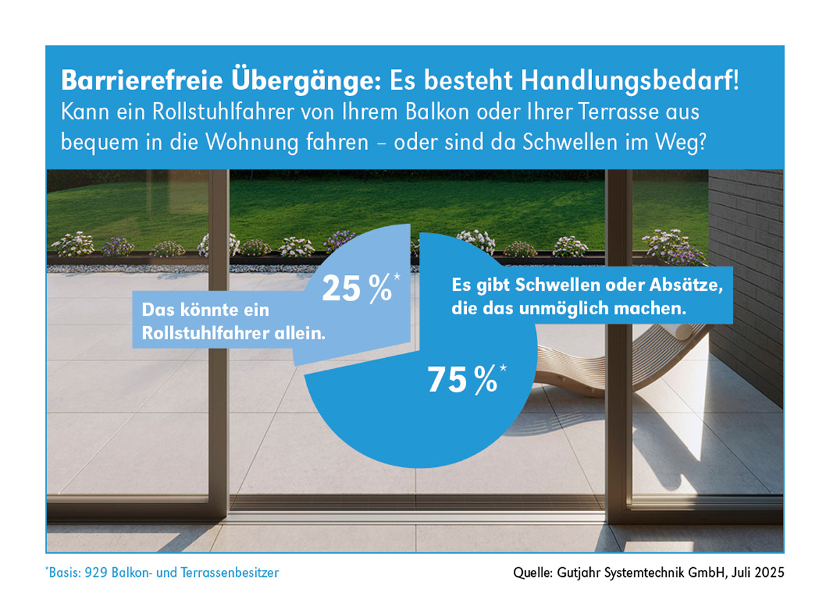 Die Nachfrage nach barrierefreien Lösungen steigt – besonders, weil fast 70 Prozent der Deutschen im Alter in ihren eigenen vier Wänden bleiben möchten, wie die Umfrage ebenfalls zeigt. »Solche Schwellen sind nicht nur unpraktisch, sie nehmen vielen Menschen im Alltag ein Stück Lebensqualität«, erklärt Gutjahr-Geschäftsführer Ralph Johann.