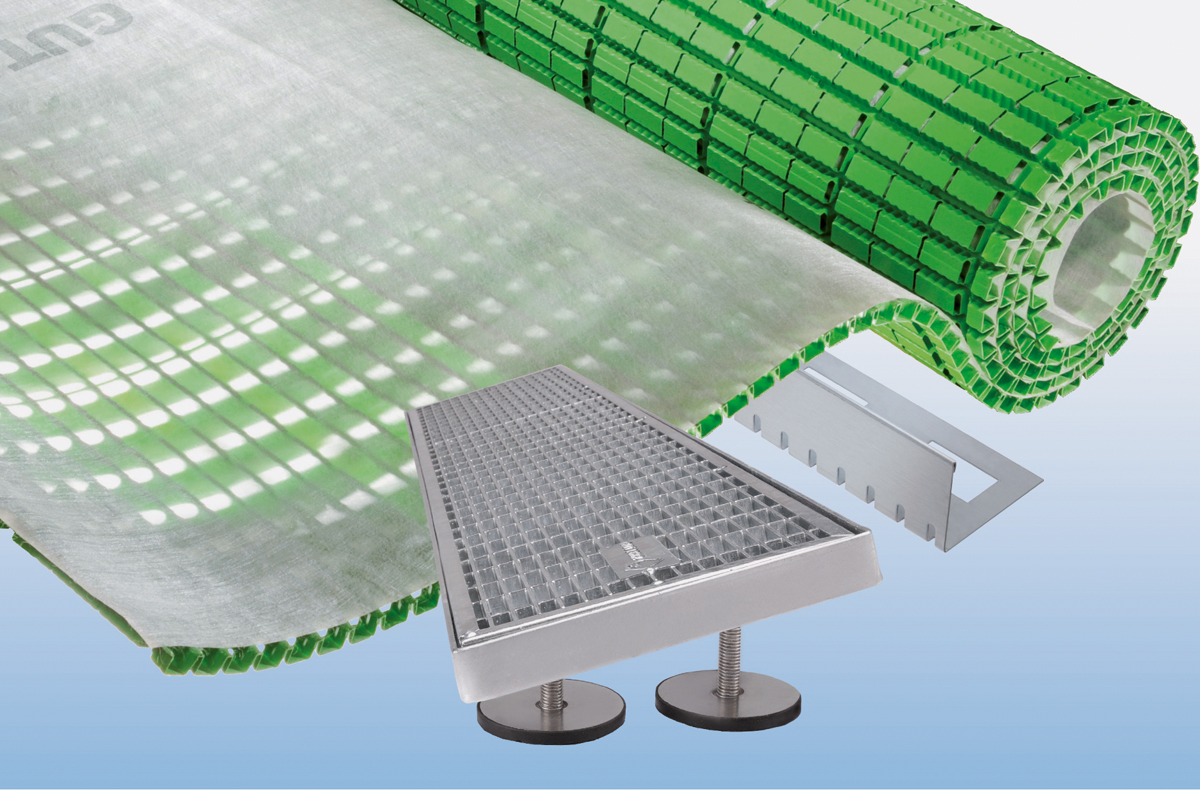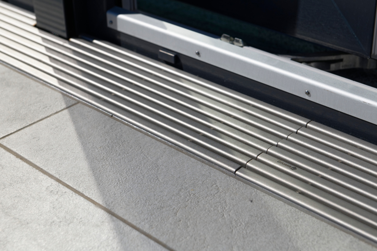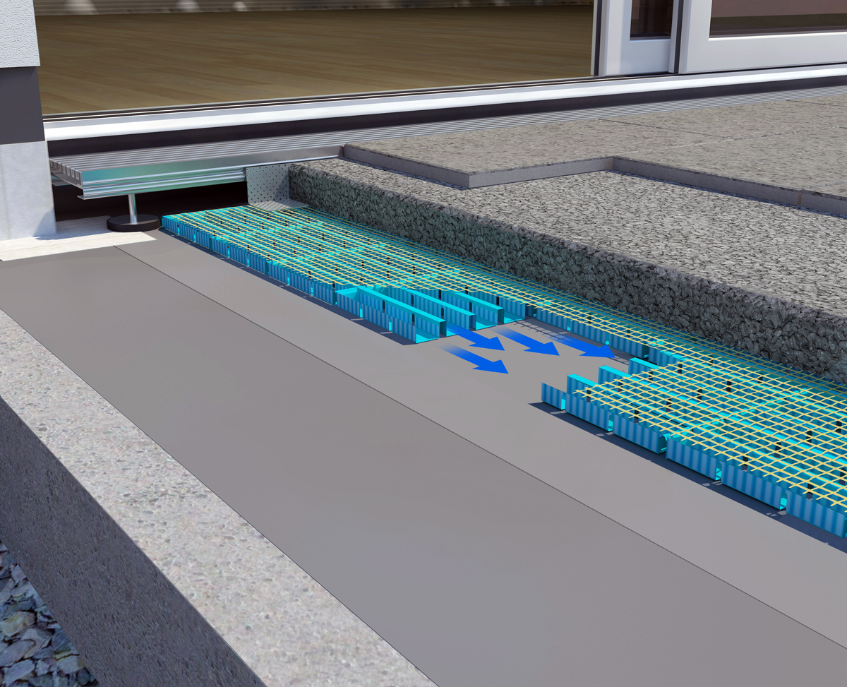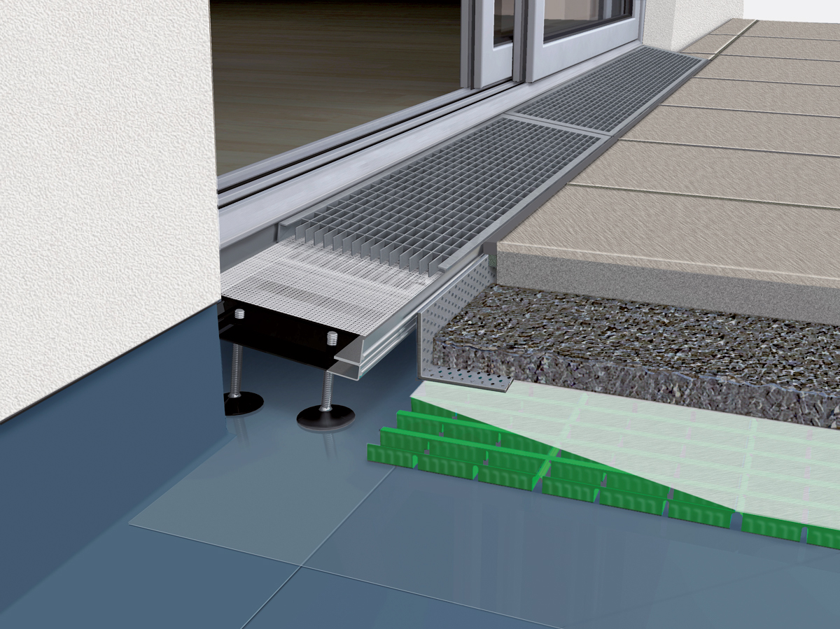 Eine praktische und sichere Lösung ist das Komplettsystem mit dem Spezialdrainrost »AquaDrain BF-Flex« plus passende Flächendrainage. Anders als Kastenrinnen ist er nach unten offen und sorgt so für die rückstaufreie Entwässerung im Türanschlussbereich, wie es die wichtigen Normen vorsehen. Der Clou: Der Rost lässt sich schräg – also als Rampe – vor bodentiefen Türen oder Fenstern einbauen. Dadurch wird sichergestellt, dass die Oberkante der Abdichtung über dem Belagsniveau liegt. Das Wasser wird dann schnell in die angeschlossene Flächendrainage geleitet – und damit weg vom Übergang.