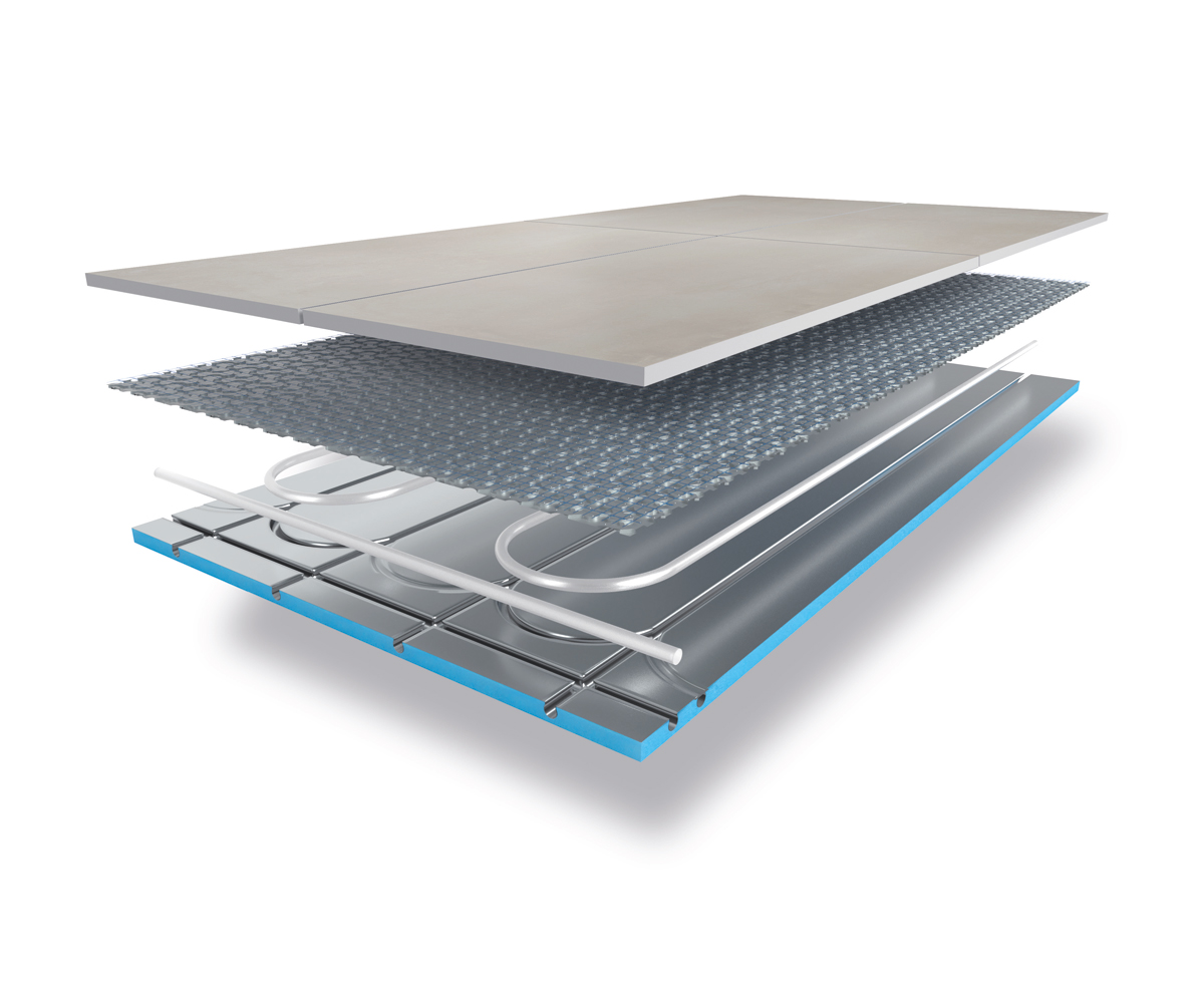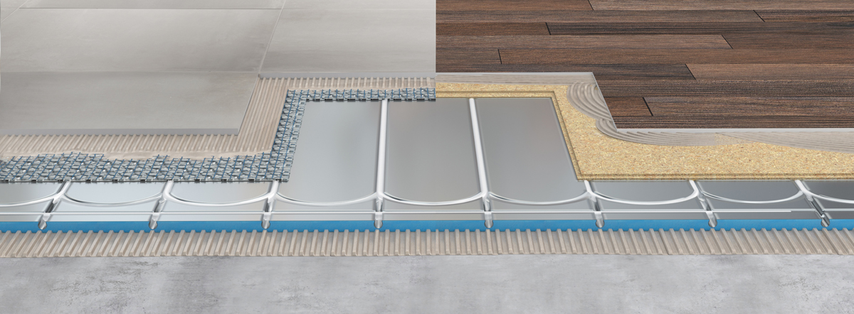 Für den Einbau der ausgewählten Fußbodenheizung war schnell eine Lösung gefunden: Ein Fliesenlegerbetrieb vor Ort übernahm die Verlegung der Fußbodenheizung zusammen mit den Oberbelägen – insgesamt rund 190 m2 in der gesamten Wohnung. Dabei entschieden sich die Eheleute für Fliesen in den Bädern und im Gäste-WC, im Wohn- und Schlafbereich sowie in der Küche wurden Vinylböden verlegt. Für das Heizungssystem spielte dies keine Rolle: Es gibt zwei verschiedene Belagsträger. Eine Entkopplungsmatte ermöglicht die Verlegung von Keramik, Fliesen oder Naturstein. Ein Unterbodenelement ist auf textile und elastische Beläge oder Mehrschicht-Parkett zugeschnitten. Alle Komponenten werden passend als Komplettsystem geliefert.