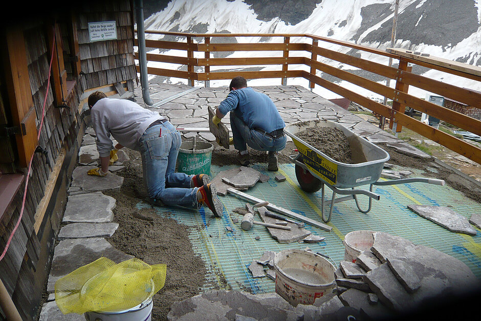 Die Sanierung der Sonnenterrasse der Badener Hütte in Osttirol war nicht nur logistisch eine Herausforderung: Sämtliche Materialien mussten per Helikopter angeliefert werden. Auch technisch verlangte die extreme Höhenlage eine besonders belastbare Lösung. Denn die neuen Porphyrplatten sollten dauerhaft schadensfrei bleiben. Erbaut wurde die Hütte 1912, danach wurde sie mehrfach erweitert und renoviert. Der Grund für die letzte Sanierung war der unansehnlich gewordene Terrassenbelag. Fast alle Platten hatten Risse und Frostabplatzungen. Kein Wunder, denn der Naturstein muss hier viel aushalten. Starke Sonneneinstrahlung, viel Regen, Temperaturschwankungen, Eis und Schnee gehören in dieser Höhe dazu. Doch wie schützt man den vulkanischen Stein auf 2 608 m am besten? Die Antwort lautete: Mit der kapillarpassiven Natursteindrainage »AquaDrain EK« von Gutjahr. »Das System haben wir speziell für die Verlegung von Naturstein auf Drainmörtel entwickelt. Es stelzt den Belag komplett auf. Dadurch bilden die Drainkanäle einen definierten Hohlraum, Wasser kann schneller und effektiver abfließen – im Gegensatz zu Drainmörtel alleine verbessert sich das Wasserableitvermögen um das bis zu 150-Fache«, erklärt Gutjahr-Geschäftsführer Johann. Gleichzeitig trocknet der Belag durch die Hinterlüftung schneller ab. Eine weitere Besonderheit von »AquaDrain EK« ist das Gittergewebe. Es bleibt dauerhaft wasserdurchlässig und setzt sich auch nicht durch die löslichen Kalke im Drainmörtel zu. Dass das auch in alpinen Höhen funktioniert, beweist die Terrasse der Badener Hütte eindrucksvoll.