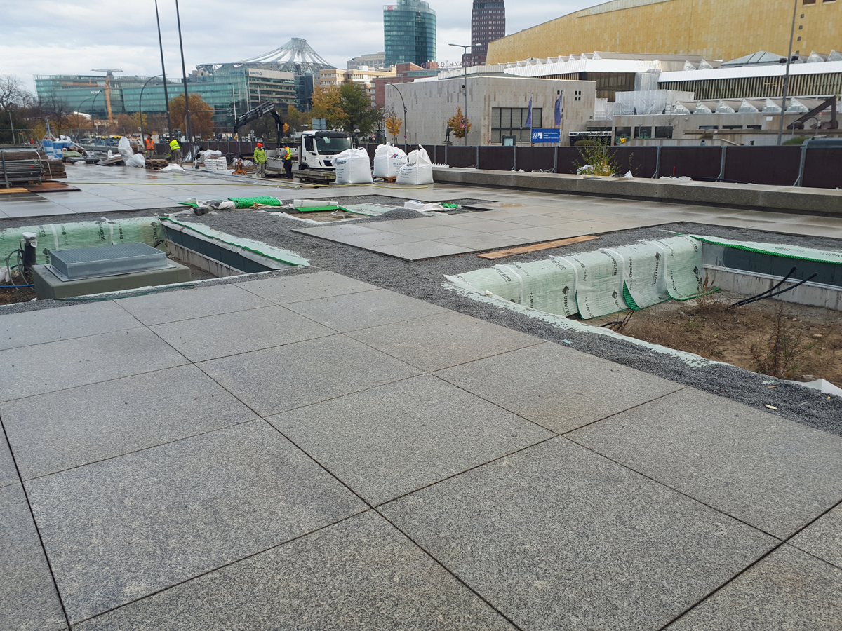 Sechs Jahre lang dauerte die Sanierung der Neuen Nationalgalerie in Berlin. Der berühmte Museumsbau von Mies van der Rohe wurde komplett bautechnisch erneuert, ohne dabei den ursprünglichen Charakter und das äußere Erscheinungsbild zu verändern. Die Arbeiten betrafen auch den Außenbereich um das Gebäude: Hier wurden sämtliche Natursteine ausgebaut, aufgearbeitet und neu verlegt – diesmal auf einer Flächendrainage. Die Herausforderung: Das Gefälle lag deutlich unter den bautechnisch empfohlenen zwei Prozent. Gelöst wurde sie mit »AquaDrain T+« in 16 mm – einer Spezialanfertigung mit dickerer Wandung als das Standard-Produkt. Sie ist für eine Flächenbelastbarkeit von 40 kN/m2 geeignet. Die dickere Wandung trägt zusätzlich dazu bei, die auftretenden Belastungen besser aufzunehmen.