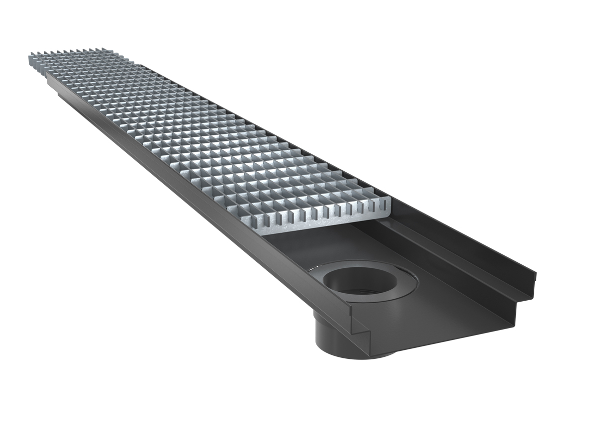 Ein integriertes Schmutzgitter schützt die Drainschicht vor grobem Schmutzeintrag. Die Rinne ist variabel ablängbar und lässt sich flexibel anpassen.