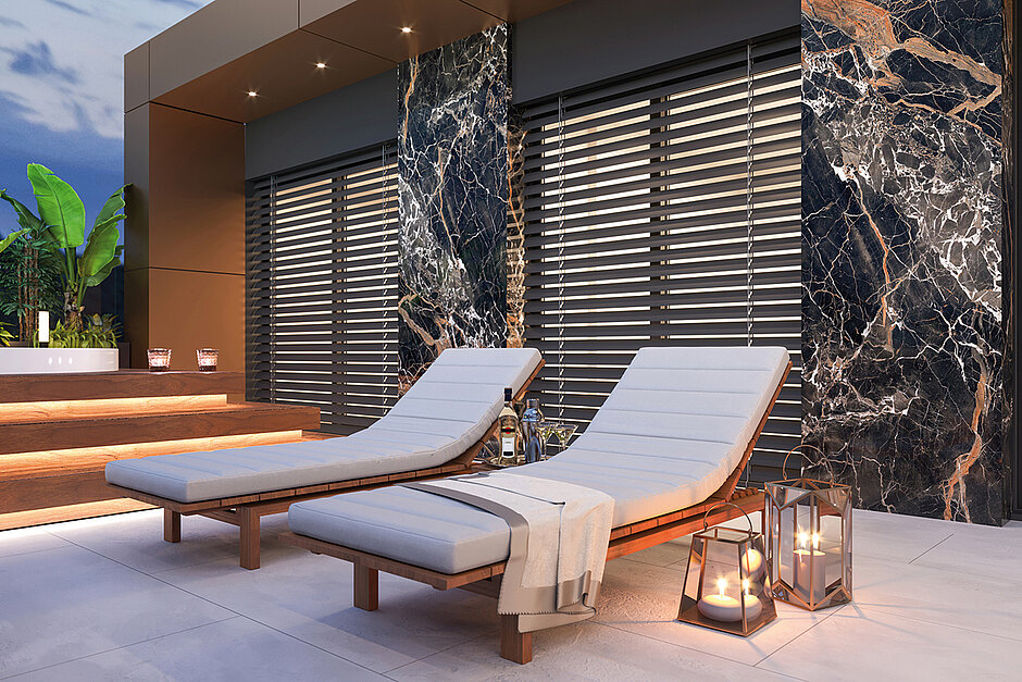 »TerraMaxx Comfort« muss nicht auf der kompletten Terrasse montiert werden, sondern kann genau dort zum Einsatz kommen, wo zusätzliche Wärme gewünscht ist – etwa im Bereich der Sitzecke, in Wintergärten oder am Pool. Das Heizsystem reagiert schnell und liefert angenehme Wärme von unten, ohne viel Energie zu verbrauchen. Im Vergleich zu den sonst üblichen Gas-Heizpilzen oder Elektro-Heizstrahlern schneidet »TerraMaxx Comfort« deutlich besser ab: Der Energieverbrauch ist um gut 70 Prozent geringer.